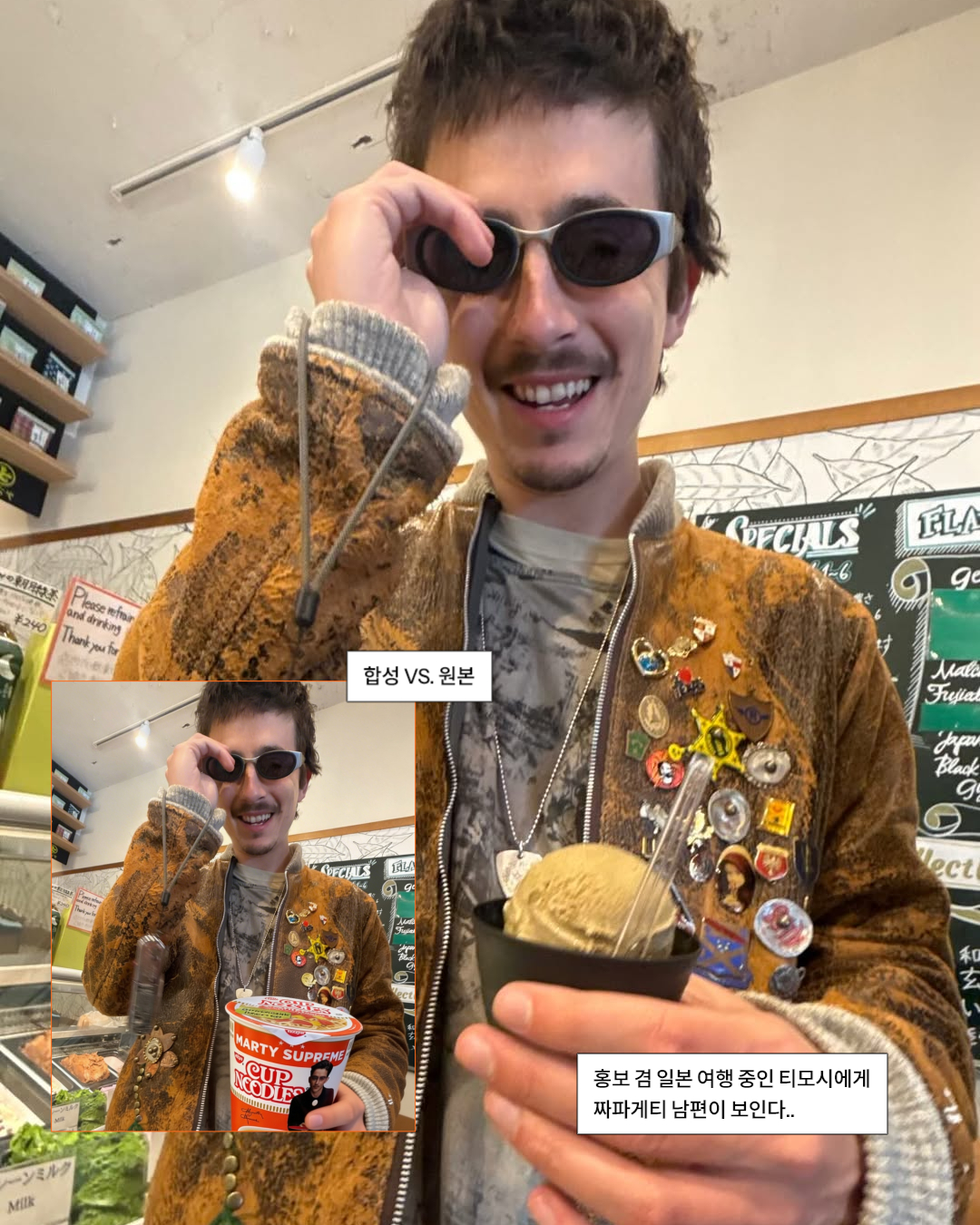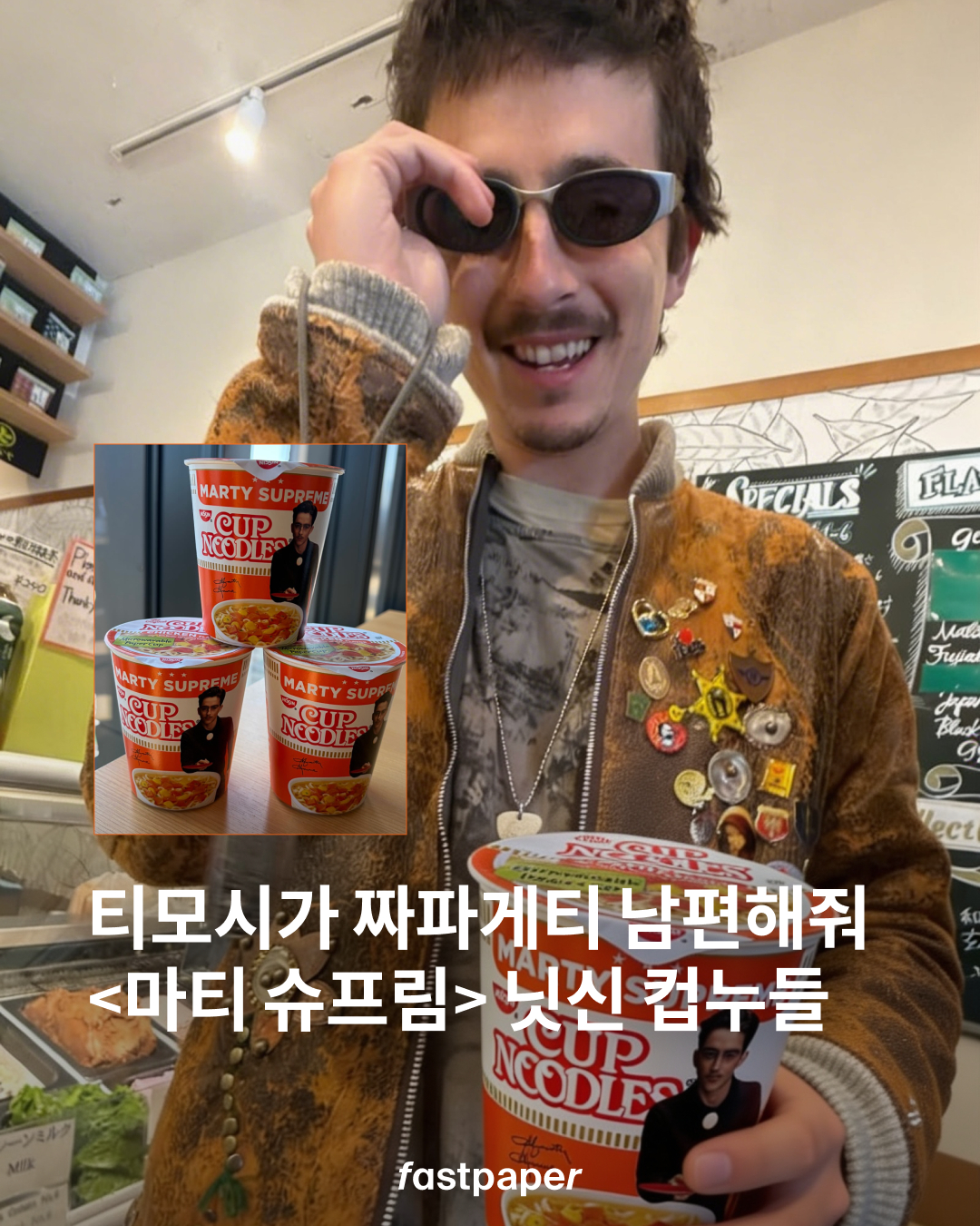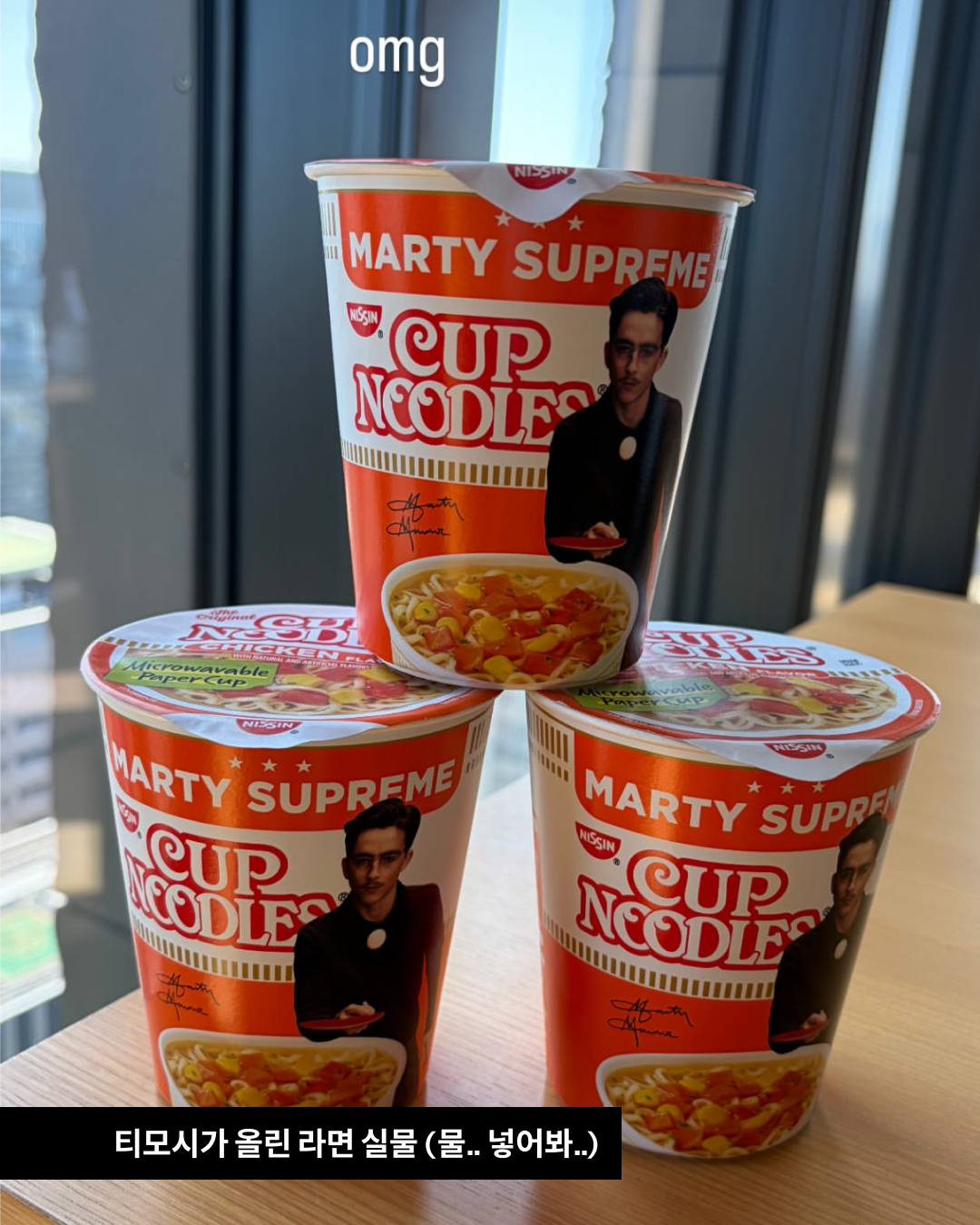 영화 <마티 슈프림>의 공식 계정에 올라온 컵라면 사진 한 장! 일본 브랜드 닛신의 컵누들 사진을 올리며 아시아 투어 예고를 했습니다. 이에 패페는 제품이 실제로 있는지 궁긍해진 찰나.. 티모시 샬라메 스토리에 올라온 실물 사진을 통해 궁금증이 해결됐습니다.