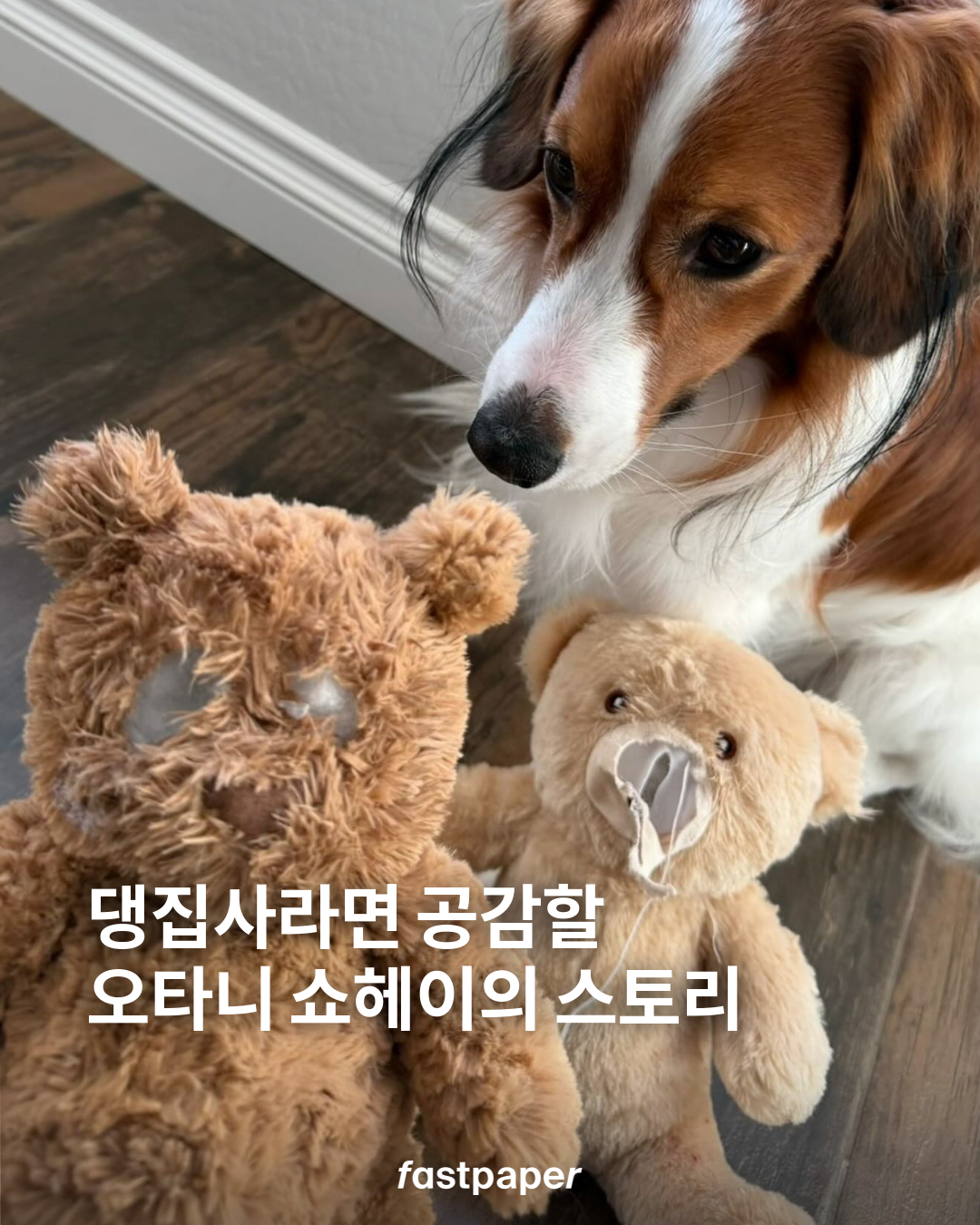 아프니까… 강아지 장난감이다.. 댕집사라면 공감 박고 갈 야구 선수 오타니 쇼헤이의 인스타그램 스토리! 그의 반려견 데코핀과 데코핀이 앙 물어 뜯어버린 곰돌이들 모십니다. 강아지를 키우는 패페 친구들이라면, 이처럼 집에 어딘가가 날라간 곰인형 몇 개는 있을 지도 몰라요.