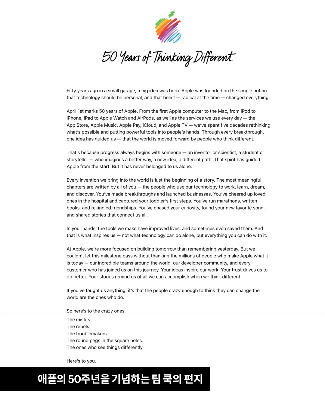 4월 1일은 애플이 창립된 지 50주년이 되는 날입니다. 첫 번째 애플 컴퓨터부터 맥, 아이팟에서 아이폰, 아이패드에서 애플 워치와 에어팟, 그리고 우리가 매일 사용하는 앱스토어, 애플 뮤직, 애플 페이, 아이클라우드, 애플 TV에 이르기까지 우리는 지난 50년 동안 가능성을 재정의하고 강력한 도구를 사람들의 손에 쥐어주는 데 전념해 왔습니다. 모든 혁신의 순간마다 우리를 이끈 하나의 생각은, 세상을 앞으로 나아가게 하는 이들은 바로 ‘다르게 생각하는 사람들’이라는 믿음이었습니다.