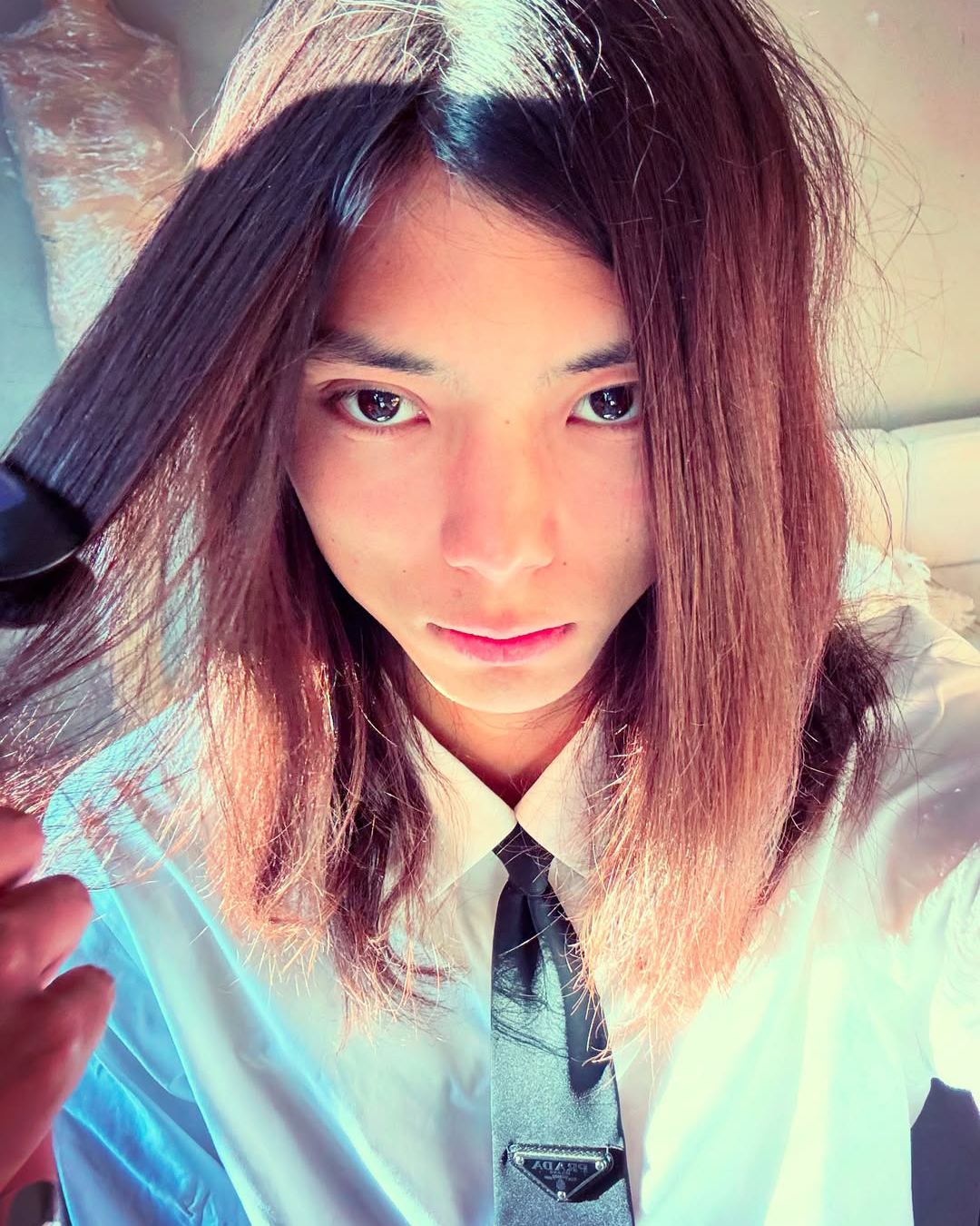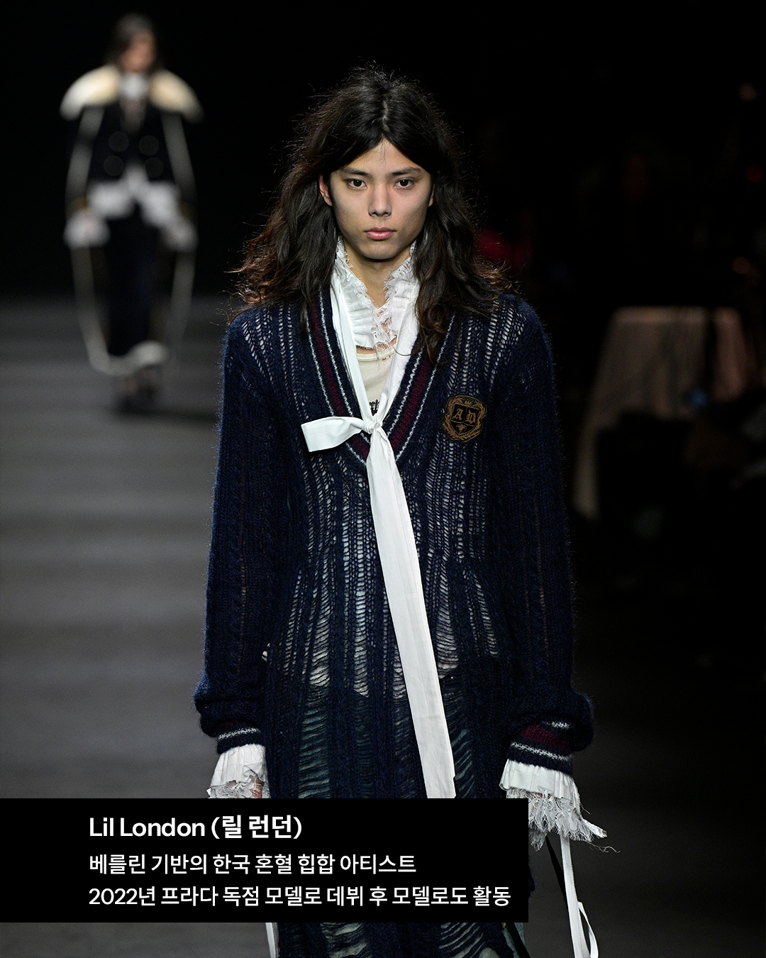 2022년 프라다 독점 모델로 데뷔한 후, 메종 마르지엘라, 루이 비통, 펜디, 시몬 로샤 등 큰 쇼에 서왔던 탑급 모델이기도 합니다. 재밌는 점은 런웨이 아래에서는 항상 같은 차림(흰 셔츠와 프라다 넥타이, 헬무트 랭 레더 팬츠)을 하고 있다는 것.