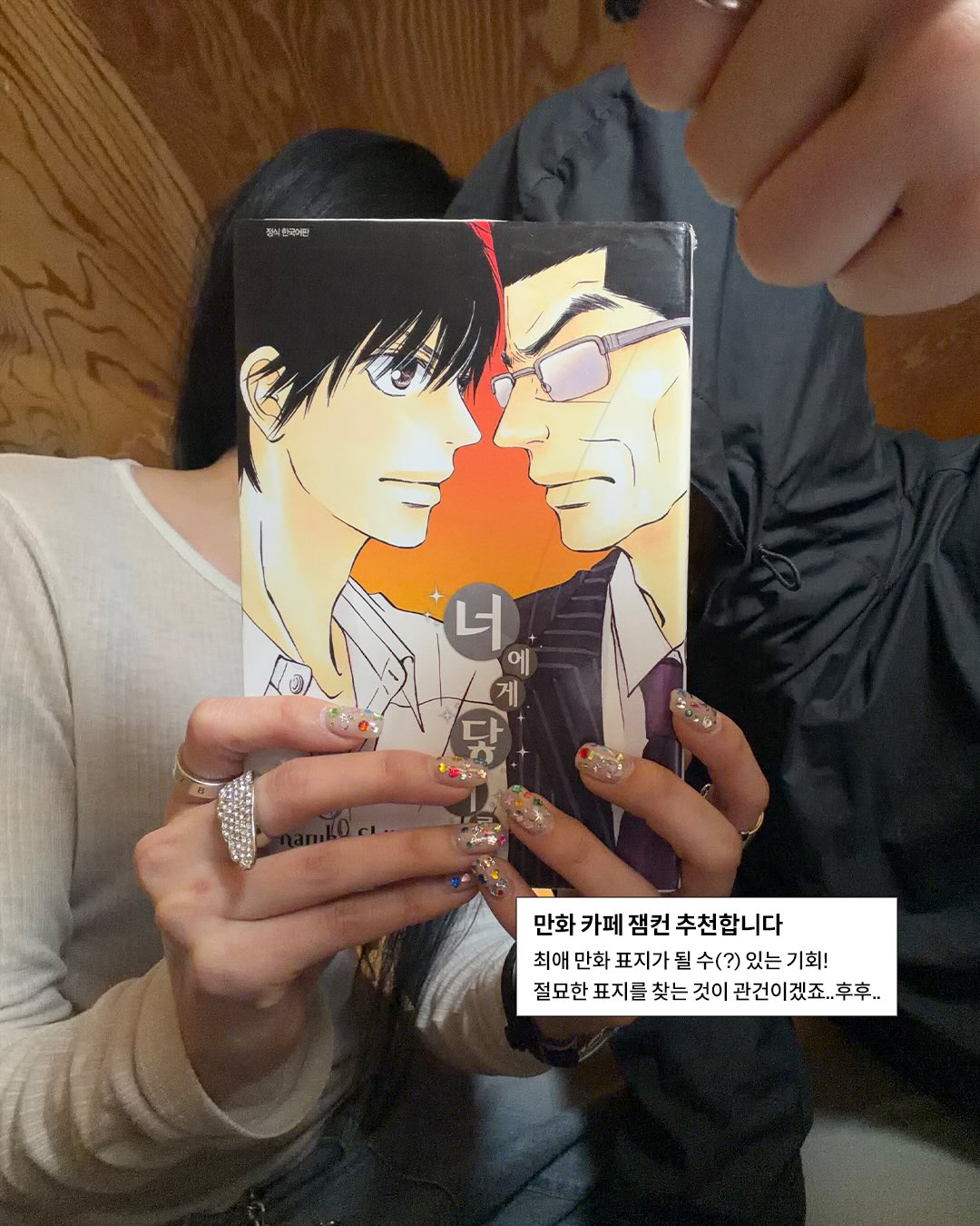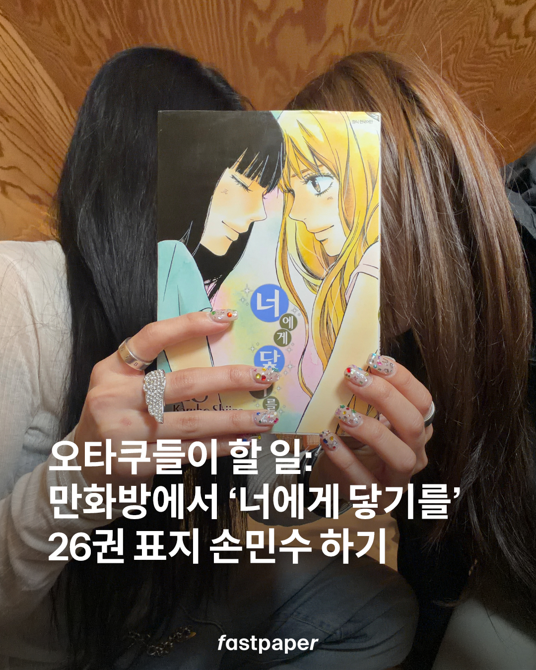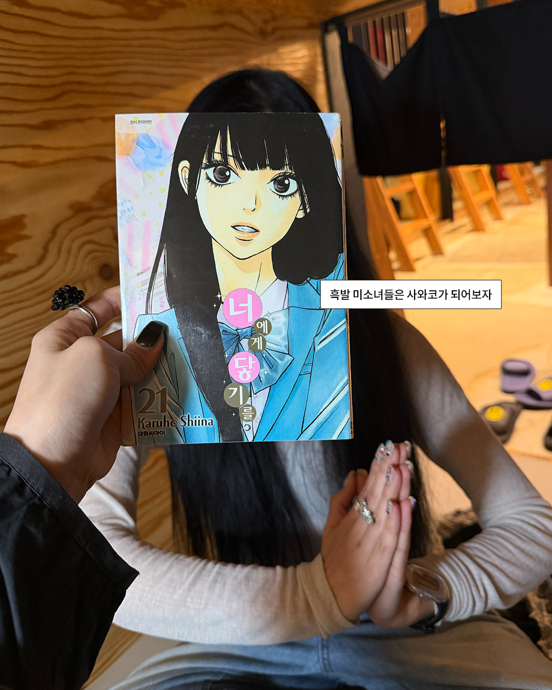 만화 카페에서 만화만 본다고요? 아쉬우니까 인증샷 하나는 남기고 와야지… X에서 핫한 만화 카페 인증샷, 패페도 해보고 왔습니다. 완벽한 각도를 찾는 것이 관건. 흑발-금발 친구 조합은 무조건 ‘너에게 닿기를’ 26권을 활용해 사진을 남겨보세요. 사와코와 쿠루미자와가 된 기분을 10초 정도 느낄 수 있습니다.
