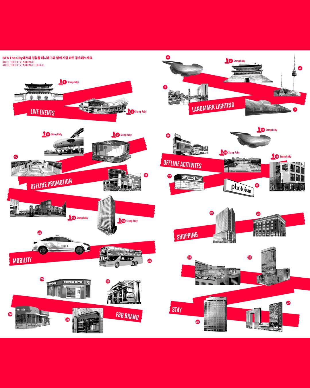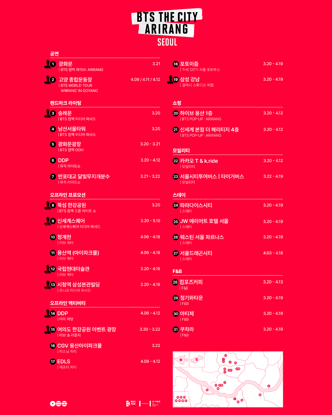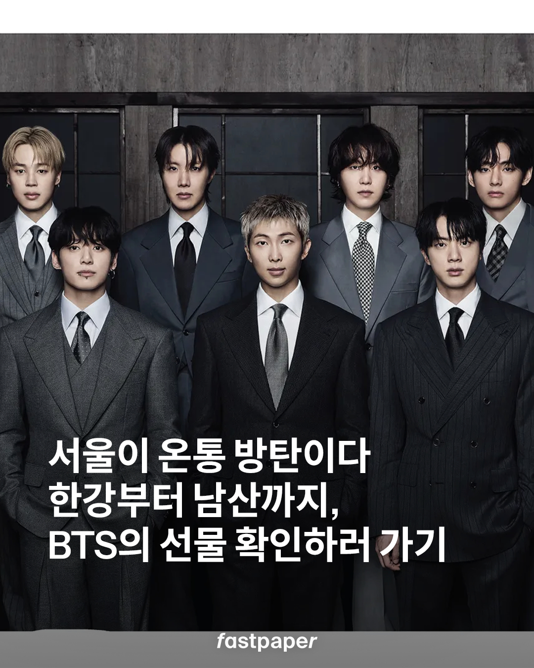 컴백을 기념해 BTS가 아미를 위해 서울 곳곳에 준비한 선물들이 공개됩니다. ’BTS THE CITY ARIRANG – SEOUL’은 도시형 플레이 파크로, 일상 속에서 BTS에 관련된 체혐형 콘텐츠나 설치 연출들을 만나볼 수 있는데요.