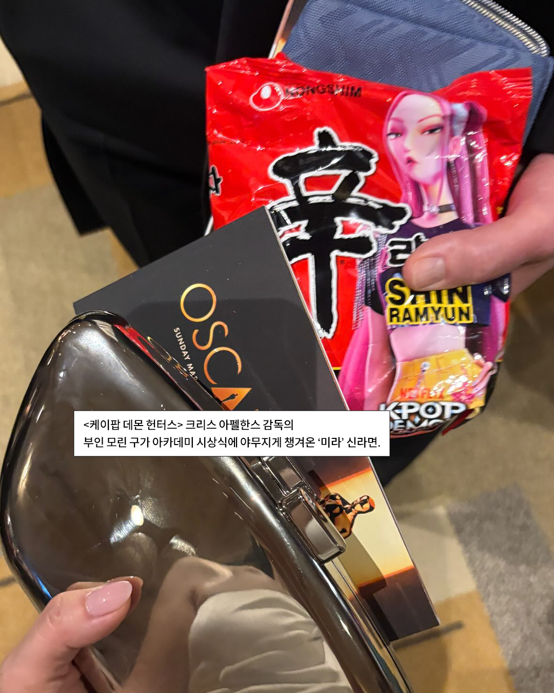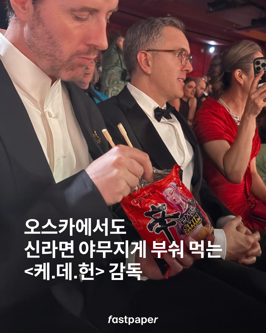 제 98회 아카데미 시상식에서 ‘신라면 뿌.먹’하는 남성 발견이요. <케이팝 데몬 헌터스>에서 매기 강과 함께 감독을 맡은 크리스 애플한스가 진짜 HOT한 먹방을 선보였습니다. 그의 아내 모린 구가 시상식 현장에 챙겨온 신라면을 야무지게 부숴 먹는 그… 역시 라면은 부숴 먹어야 제맛인 것을 크리스도 아나 봐요.