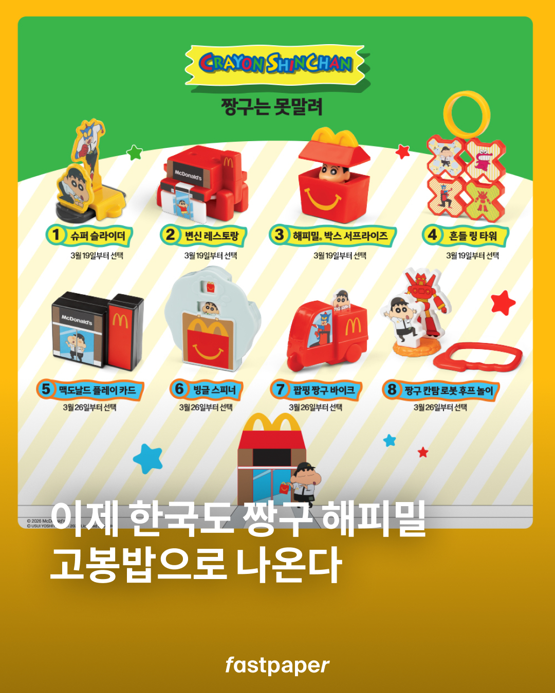 울라울라~.. 이번 맥도날드 해피밀은 <짱구는 못말려>와 함께합니다. 3월 19일부터 구매 가능한 ‘슈퍼 슬라이더’, ‘변신 레스토랑’, ‘해피밀 박스 서프라이즈’ 등 하나쯤 소장하고 싶은 라인업이죠. 놓쳤다면 걱정말고 26일부터 만날 수 있는 굿즈들을 노려보면 되겠습니다.