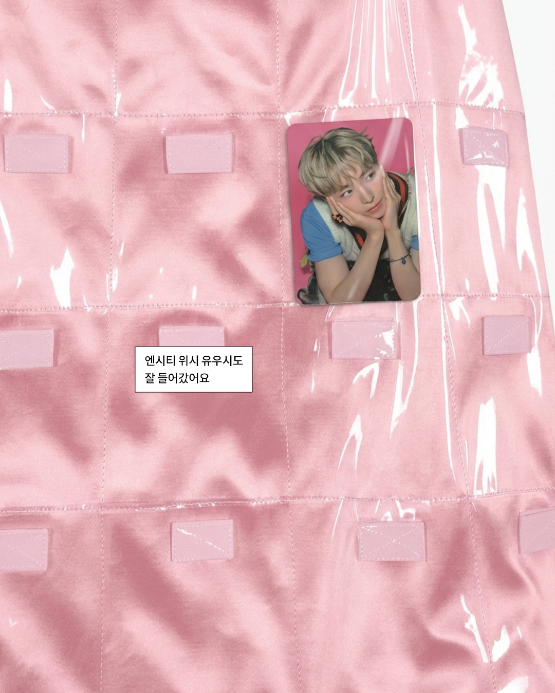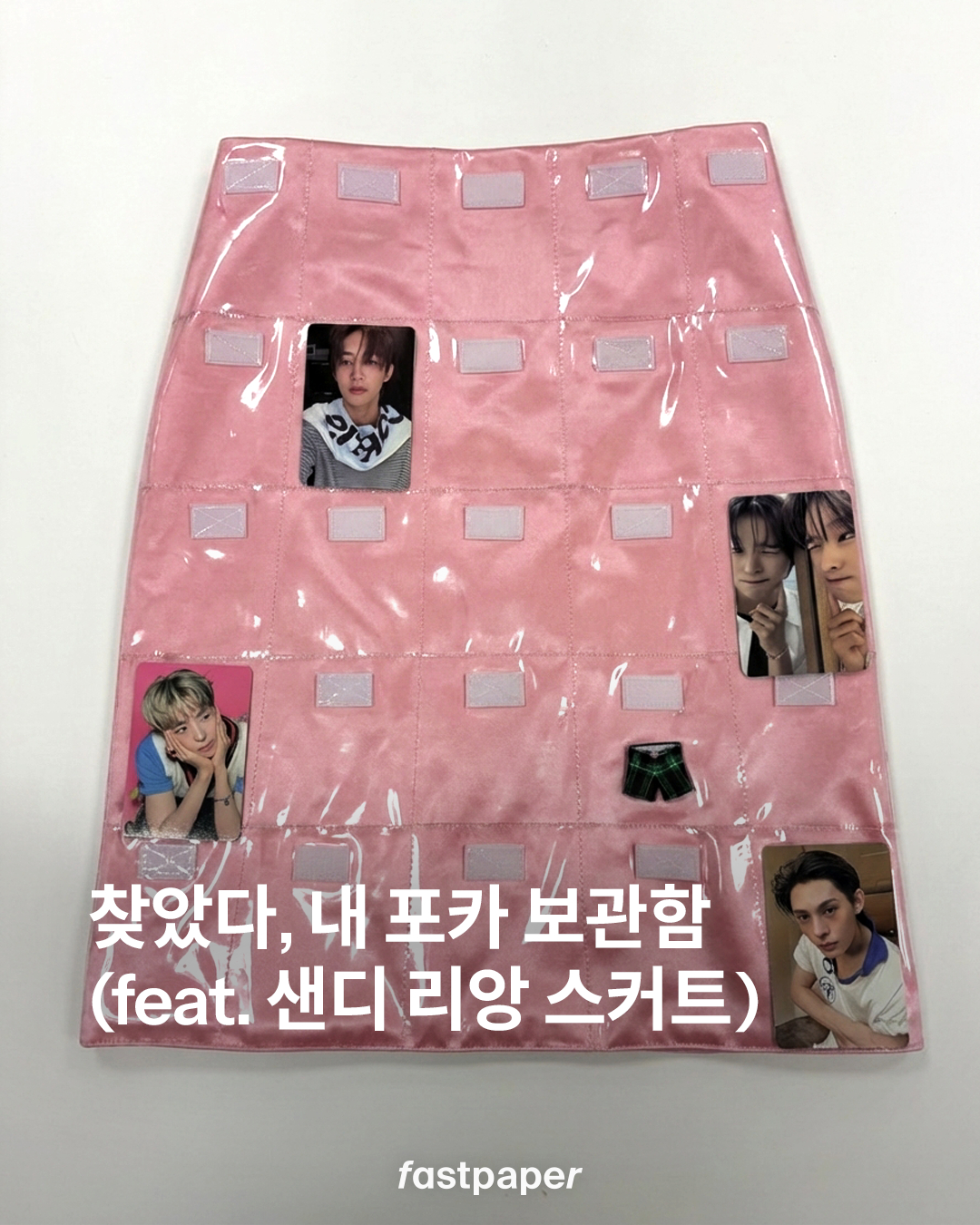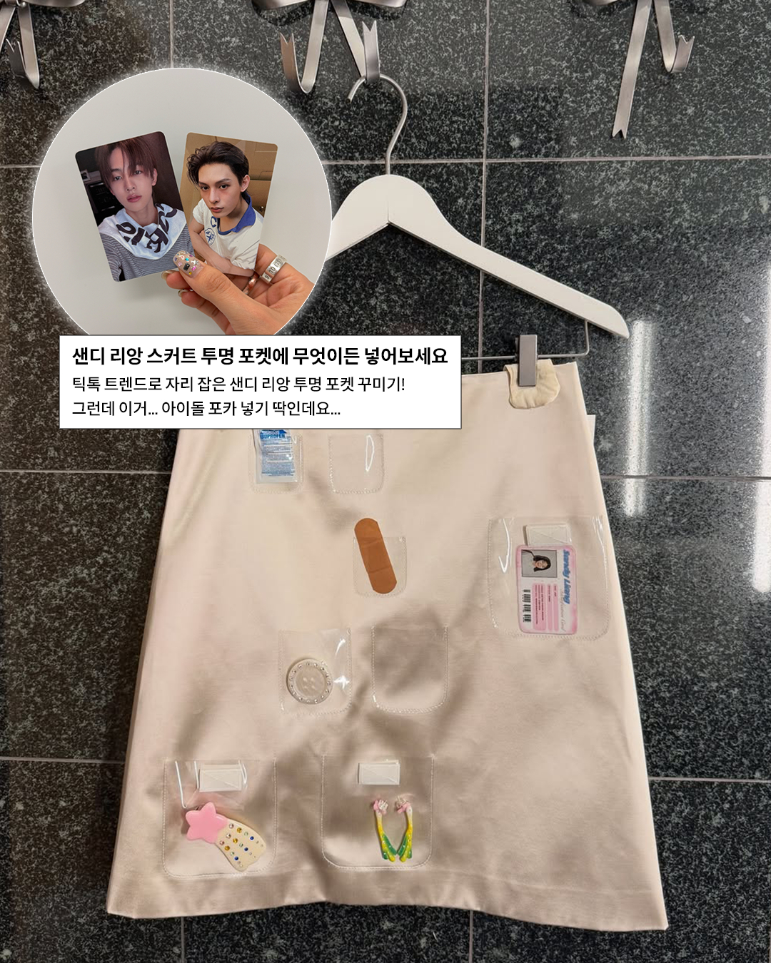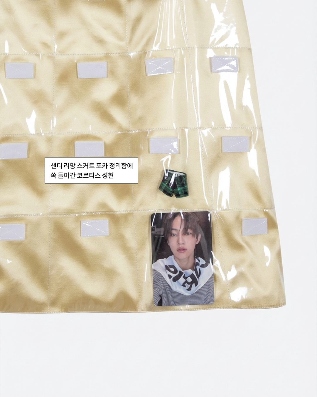 패페는 귀여운 오브제 대신 최애 포토 카드를 넣어봤어요. 샌디 리앙 스커트만큼 완벽한 포카 보관함은 없을 지도 몰라… 샌디 리앙 주머니에 쏙 들어간 코르티스와 엔시티 위시의 모습은 슬라이드를 넘겨 확인하세요.