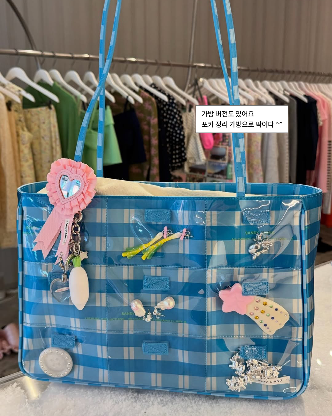 샌디 리앙 스커트, 입지 말고 포토 카드에 양보하세요. 샌디 리앙의 투명 포켓 스커트에 귀여운 오브제를 넣는 것이 틱톡 트렌드로 떠오르고 있습니다. 머리 핀, 미니어처, 단추 등 작은 크기의 물건들을 넣는 것이 일반적인 방식!