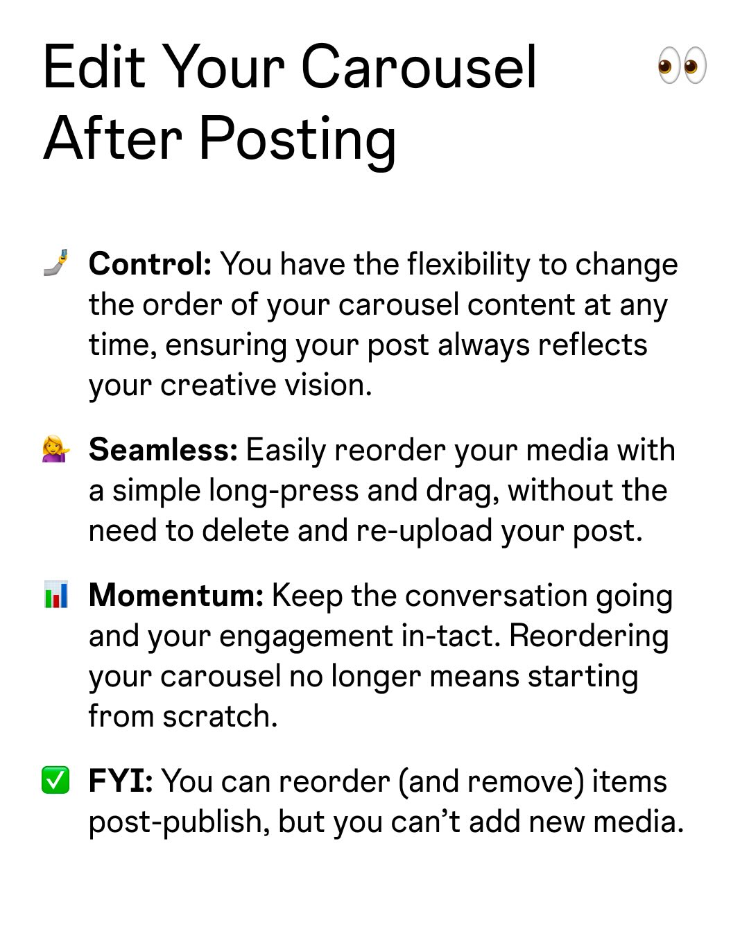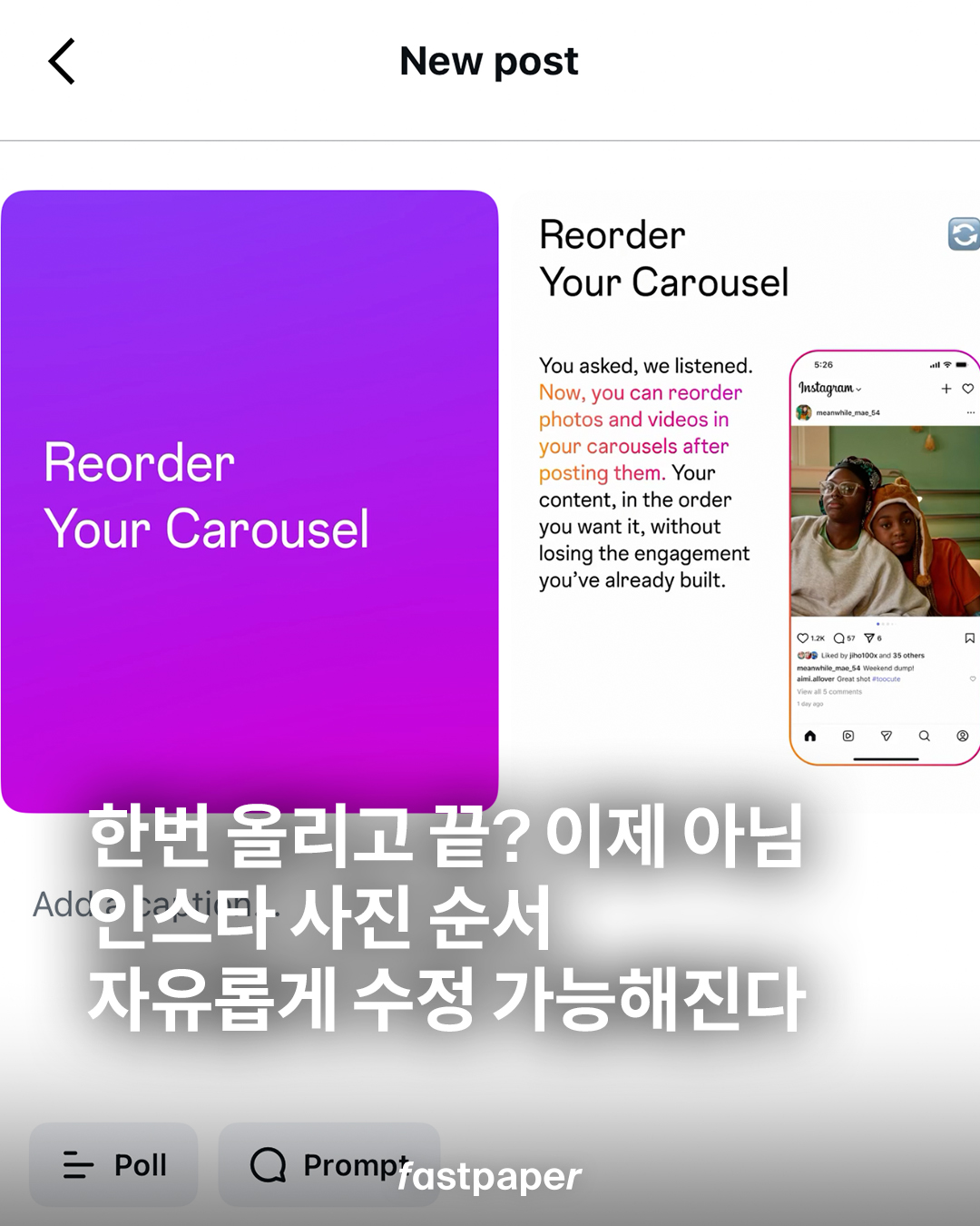 그동안 순서 잘못 올리면 삭제 후 재업로드밖에 답이 없었죠. 이제는 게시물 그대로 유지한 채, 길게 눌러 드래그만 하면 원하는 순서로 재정렬이 가능합니다.