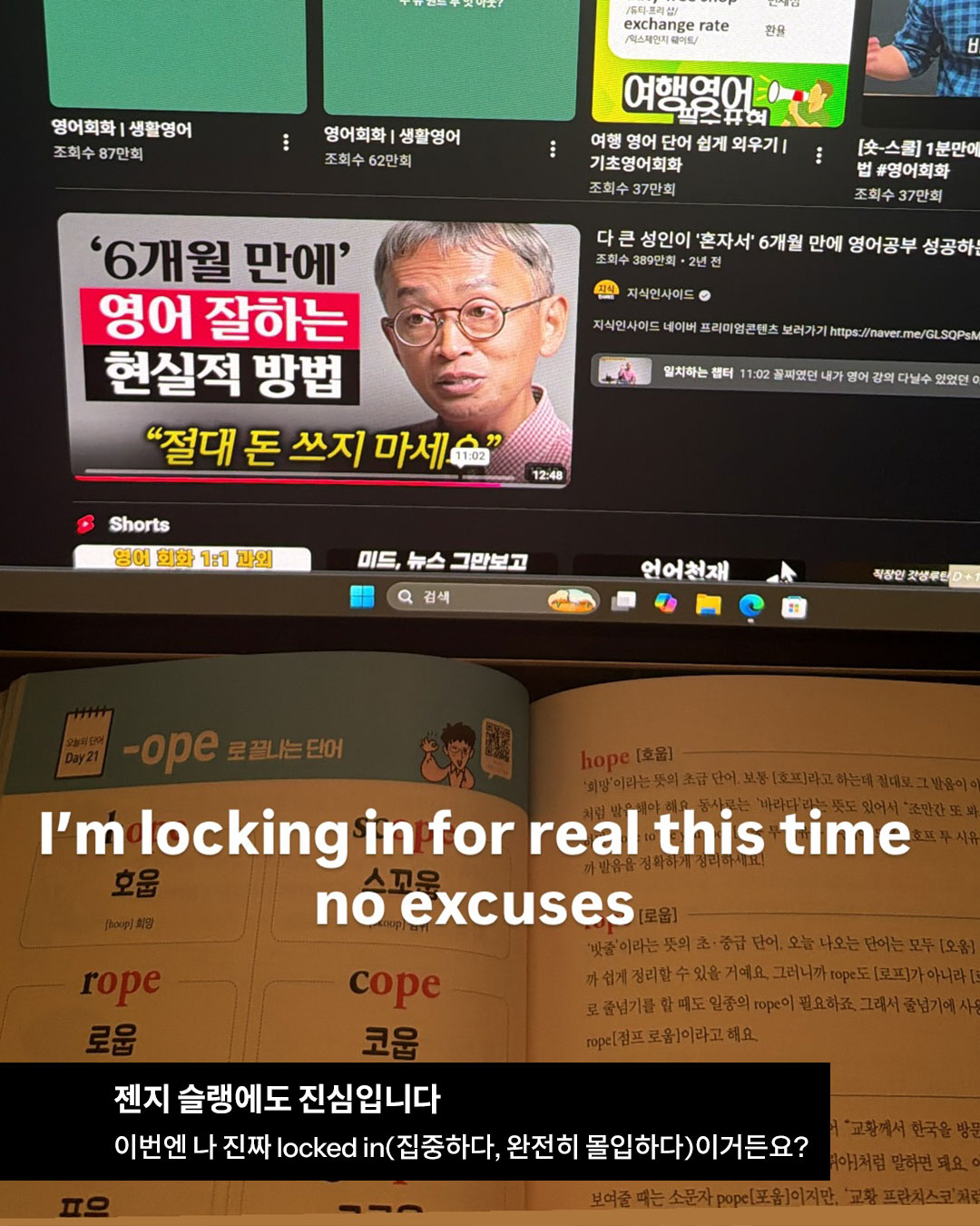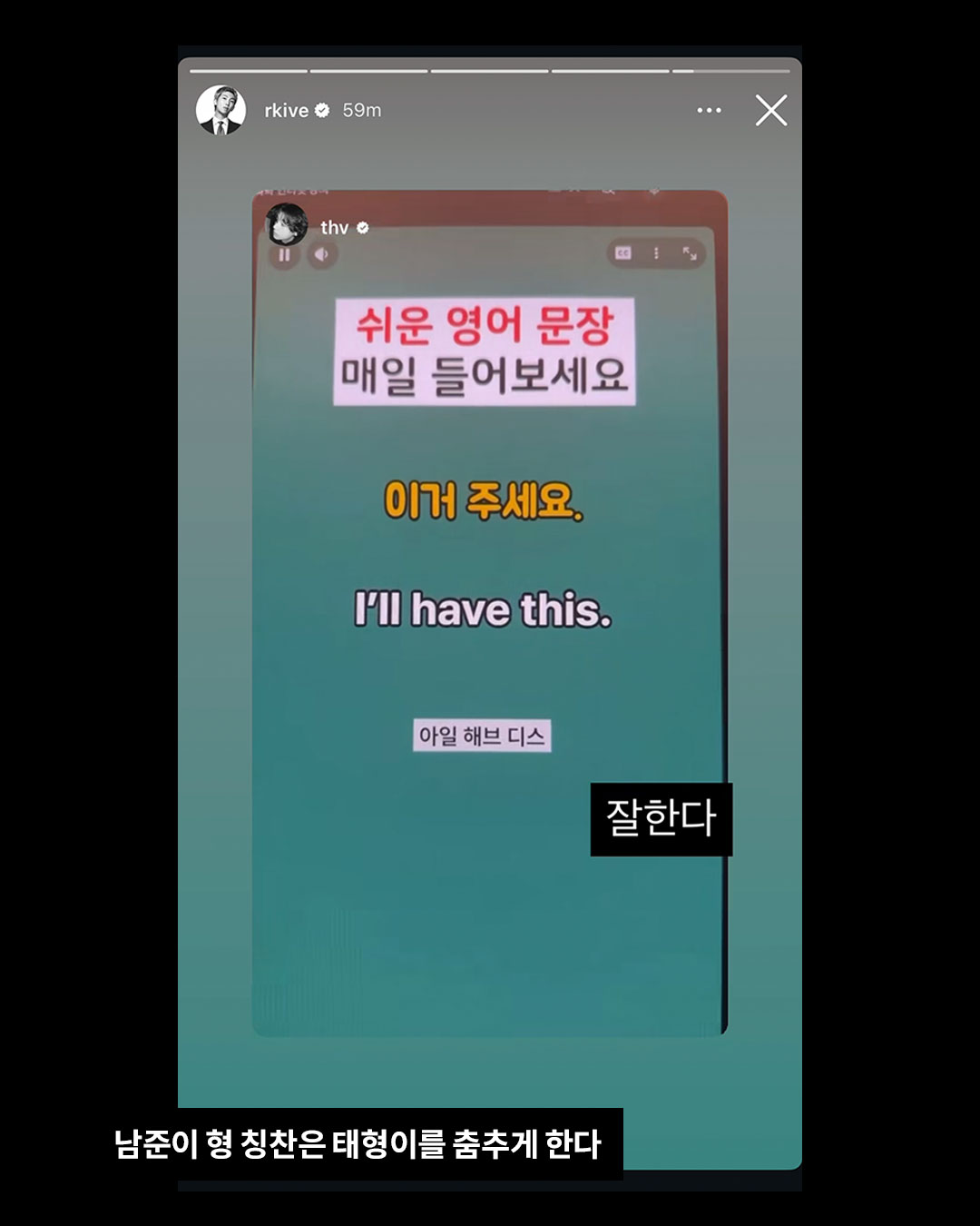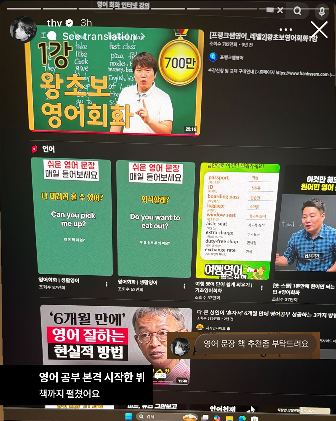 뷔의 인스타그램 스토리에 올라온 영어 공부 첫날. 프랭크쌤영어, 지식인사이드 유튜브 영상을 책과 함께 보며 몰입한 모습인데요. RM의 칭찬에 힘입어, 지미 팰런과 프리토킹 하는 그 날까지 가보는 거야…