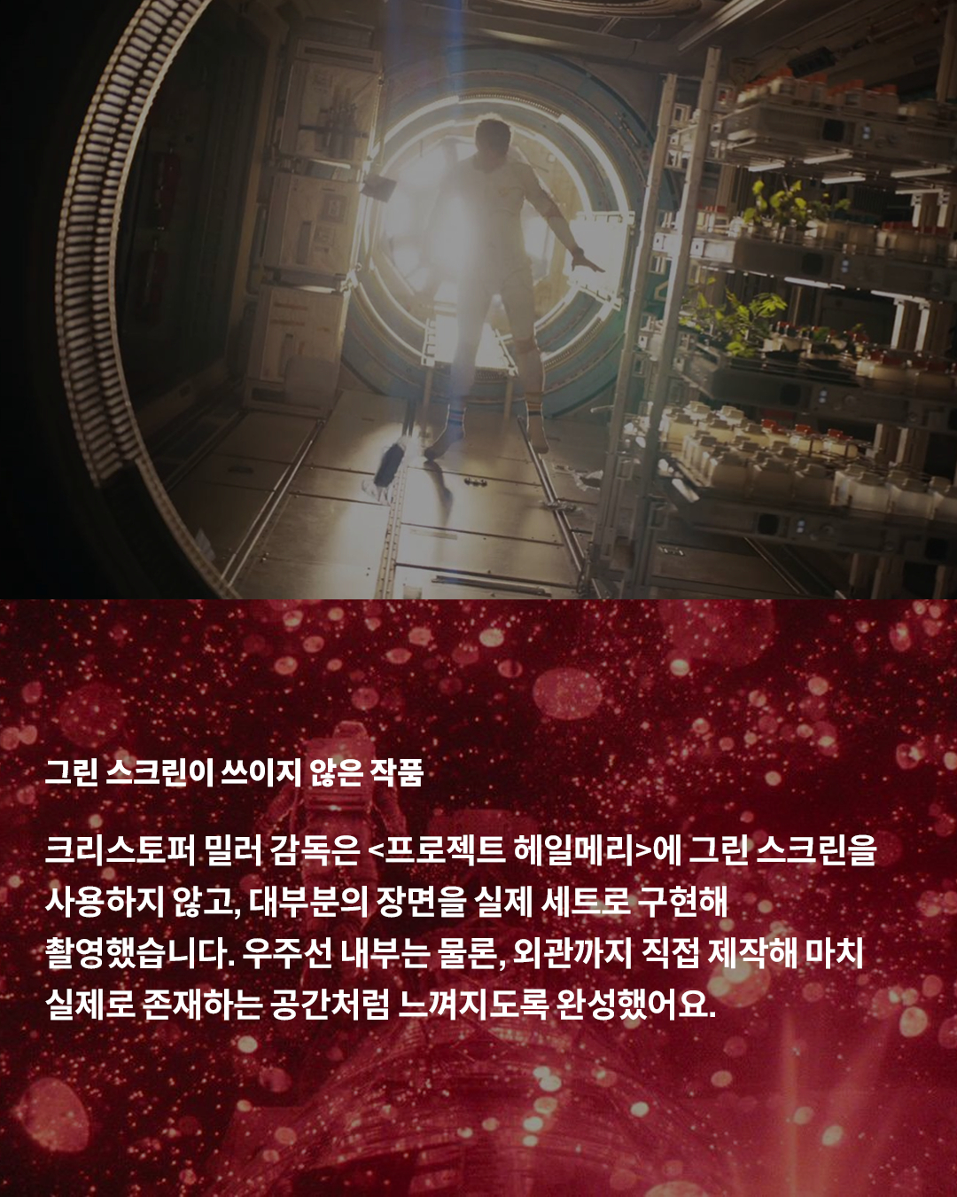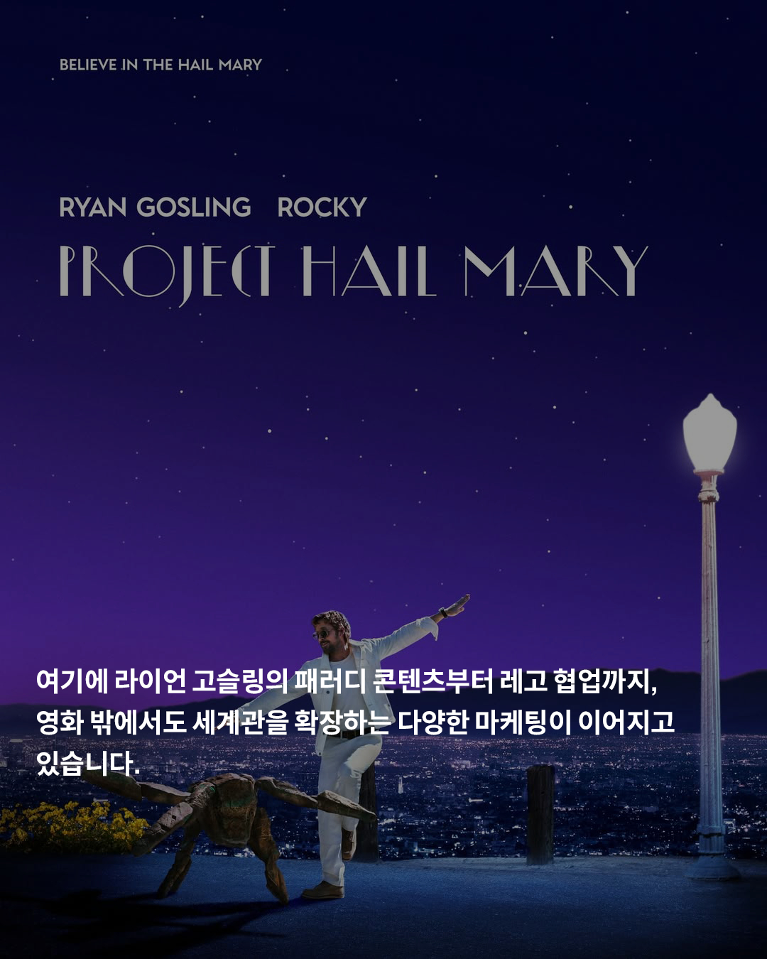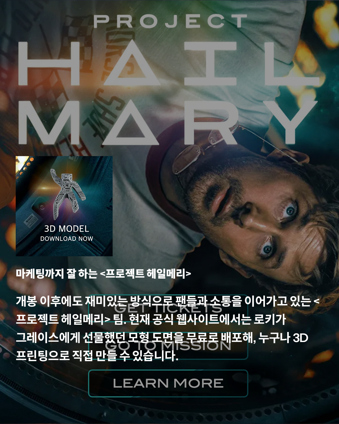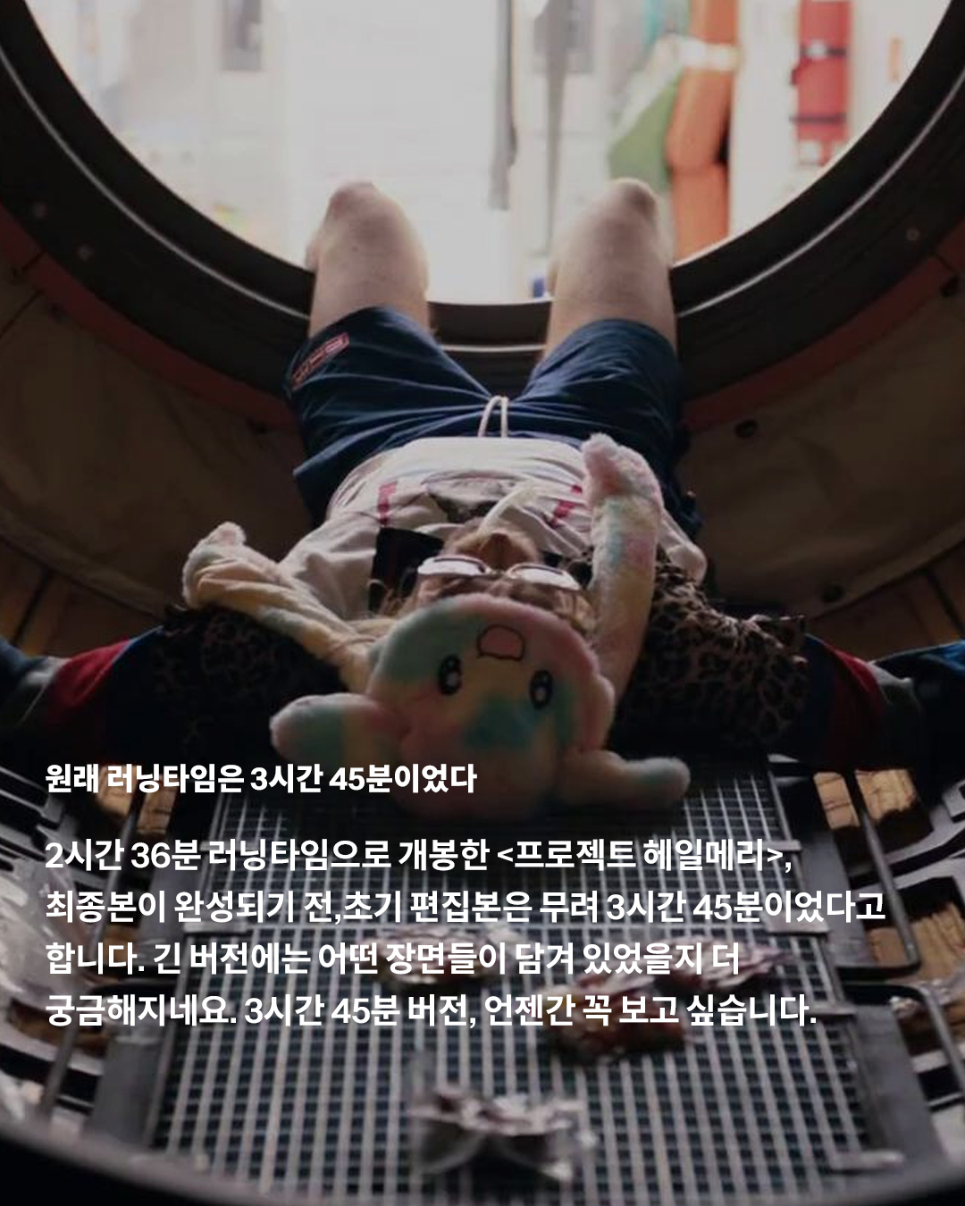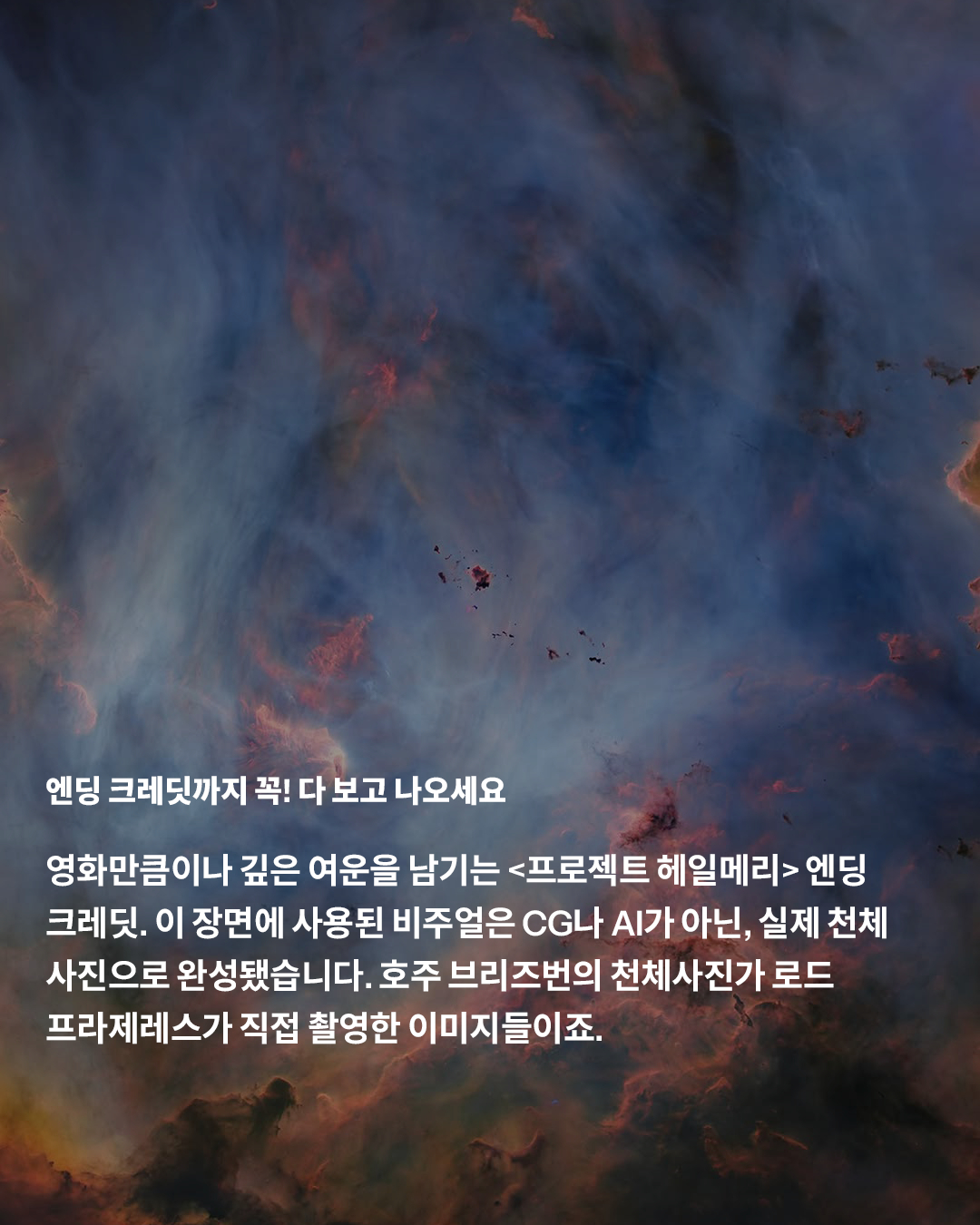 <프로젝트 헤일메리> 보신 분? 라이언 고슬링과 산드러 휠러가 출연하고 필 로드와 크리스토퍼 밀러가 연출한 신작으로, 앤디 위어의 동명 소설을 원작으로 한 SF 영화입니다. 인류를 구하기 위해 우주로 떠난 그레이스에게 벌어지는 일들을 그린 작품으로, 지난 18일 개봉 이후 국내에서 큰 반응을 모으고 있는데요. 관람 후에 보면 더욱 흥미로운 포인트들을 모았습니다. 기존 러닝 타임부터 엔딩 크레딧을 꼭 챙겨 봐야 하는 이유까지, 슬라이드를 넘겨 확인해 보세요.