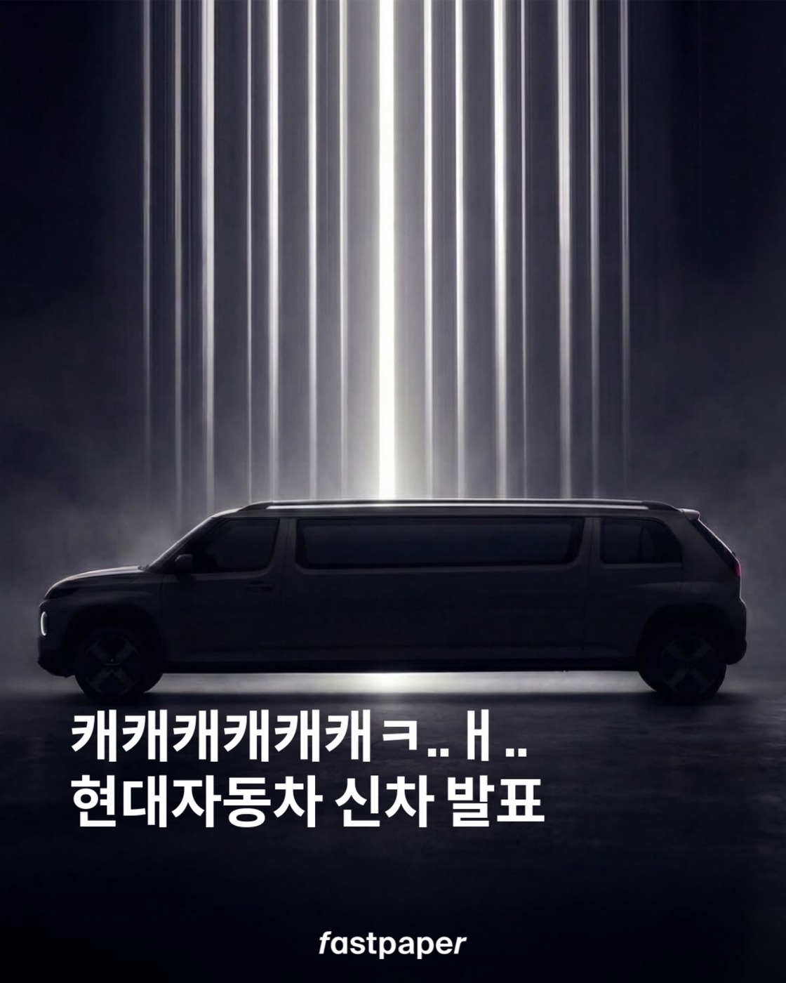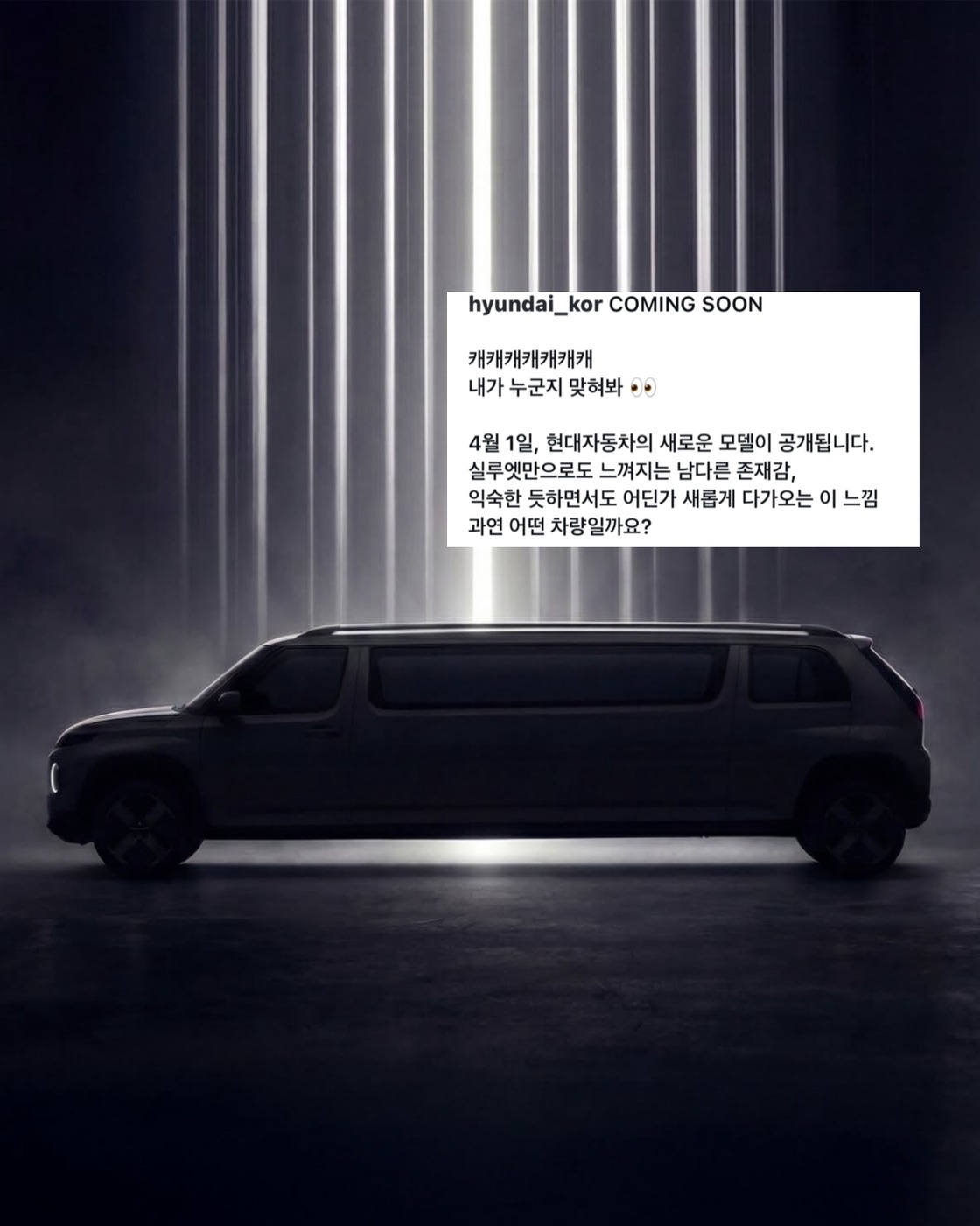 현대자동차 신차 발표? 아 맞다 만우절이지.. 현대자동차가 어제 의문의 실루엣과 함께 신차 발표를 예고했습니다. “캐캐캐캐캐캐캐 내가 누군지 맞혀봐“ 라는 문구와 함께 만우절 기념 콘텐츠를 올렸는데요. 네티즌들은 캐길어진 캐스퍼로 추측하고 있죠. 리무진 버전(?) 캐스퍼 탄다, 안 탄다?