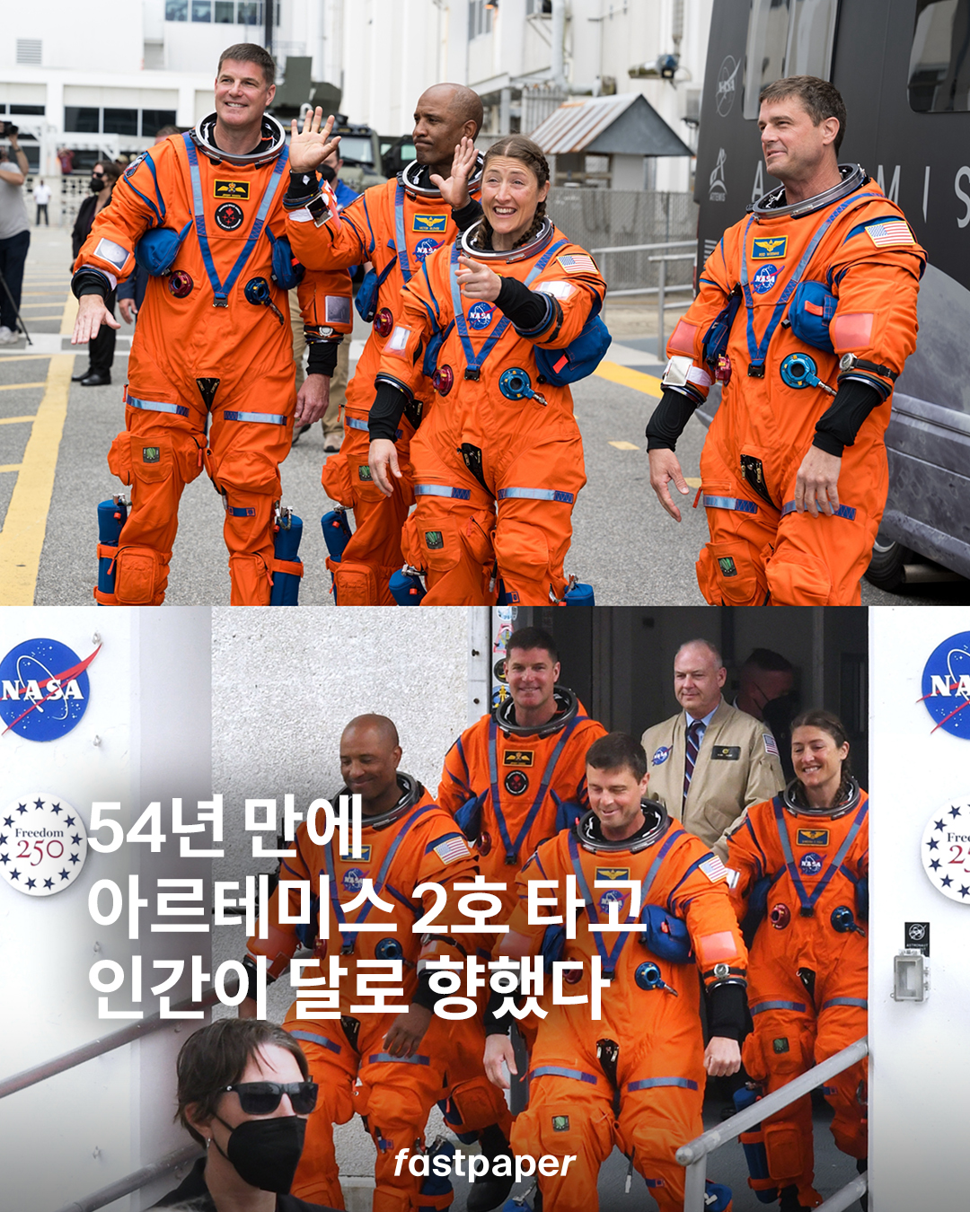 이번 임무는 달 착륙이 아니라, 오리온 우주선이 사람을 태우고 달 주변을 비행한 뒤 지구로 복귀하는 시험 비행에 가깝죠. 리드 와이즈먼, 빅터 글로버, 크리스티나 코크, 제레미 핸슨까지 총 4명이 탑승했습니다.