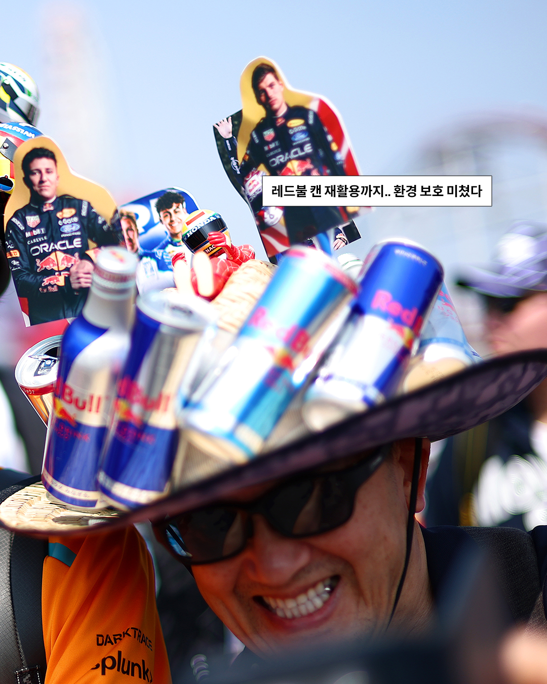 레드불을 응원하는 한 팬은 레드불 음료를 재활용해 모자 꾸미기를 완료했네요. 다들 목 관절 조심하세요… 다치지 않게…