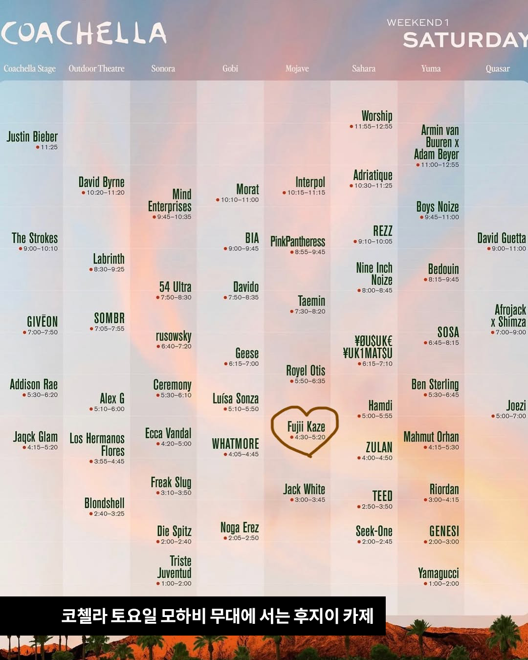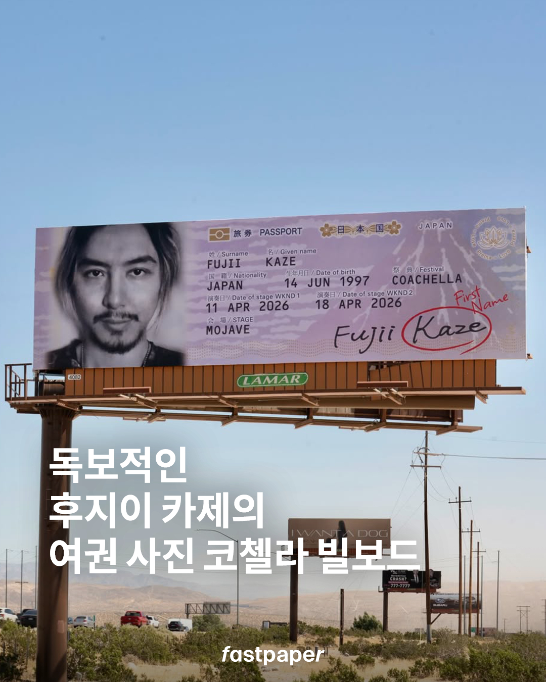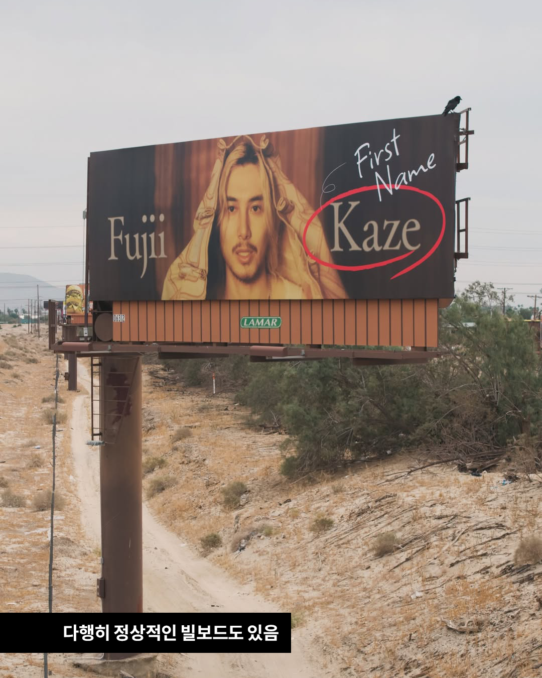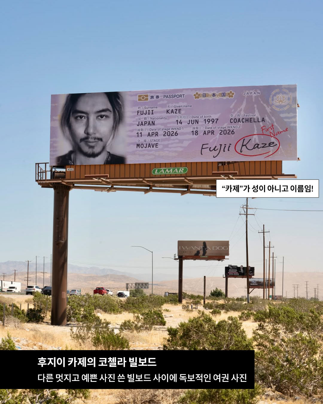 코첼라 페스티벌을 향하는 길목에는 출연 아티스트들의 빌보드 광고가 걸리곤 하죠. 다들 멋지고 예쁜 사진으로 눈길을 사로잡으려고 하는데 이 사진은 뭐죠? 후지이 카제는 본인의 여권 사진을 빌보드에 걸었습니다. ‘카제’가 성이 아닌 이름이라는 표시와 함께요.
