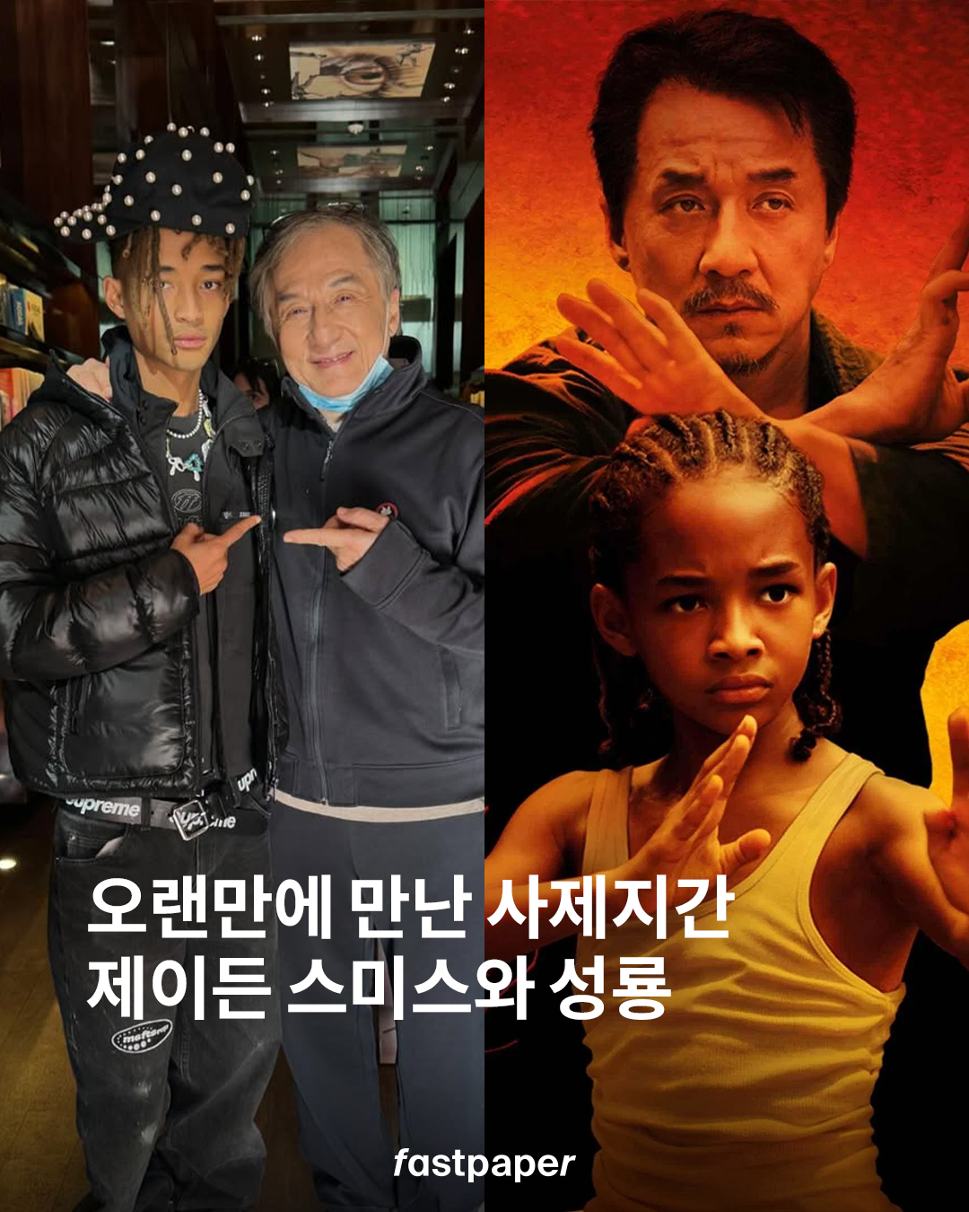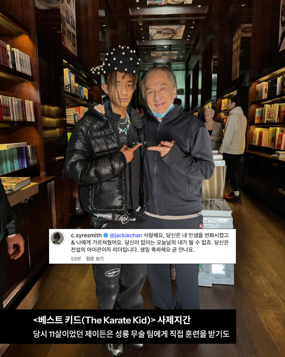 제이든 스미스가 성룡의 생일을 축하하며 함께 찍은 사진을 공유했습니다. 이 둘은 2010년 영화 <베스트 키드(The Karate Kid)>에 사제지간으로 출연했죠.