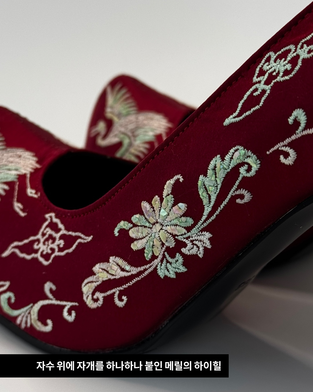 또한, 두 하이힐은 자세히 보면 각각 다른 디테일을 담고 있습니다. 앤의 경우 실 색상을 다채롭게 하여 화사한 화려함을 표현했으며, 메릴은 은은한 자개빛 자수 위에 작은 자개를 하나하나 붙여 우아한 화려함을 나타냈죠.