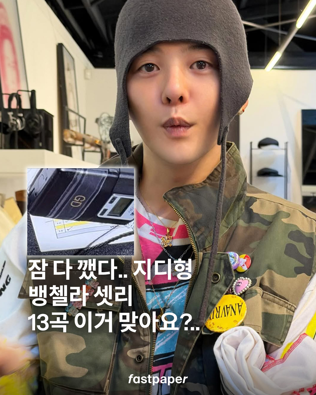 이미 눈치챈 VIP들도 있겠지만, 핑크 모자를 쓴 지디 아래 놓인 종이를 자세히 보면 ‘13’처럼 보이는 숫자가 적혀 있죠. 사진을 반대로 돌려 보면 더 잘 보입니다.