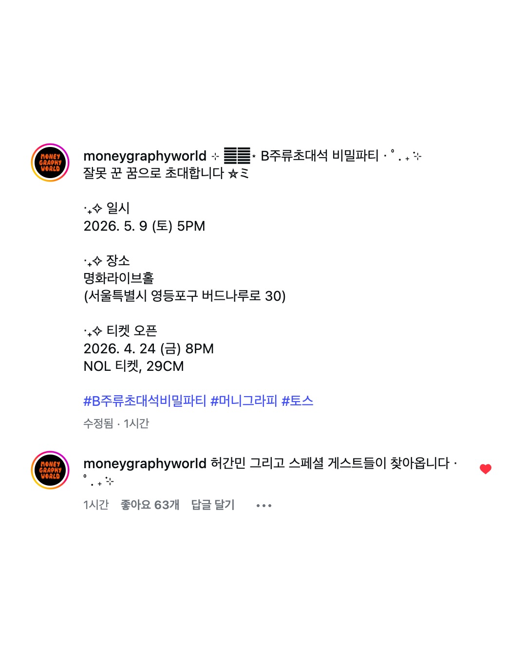허키 시바새키, 김간지, 강민경 세 사람이 진행하는 <B주류 초대석>이 인기에 힘입어 파티를 개최한다는 소식입니다.