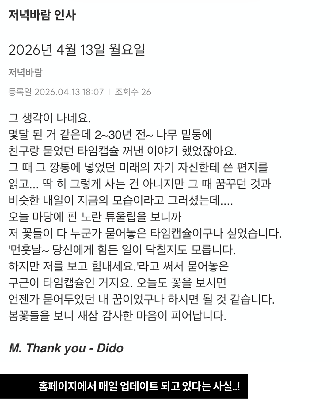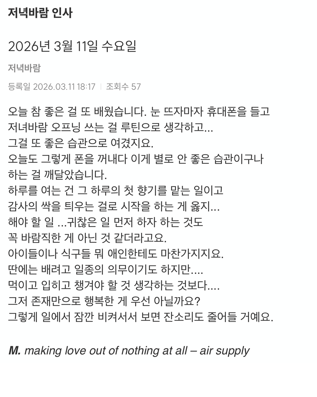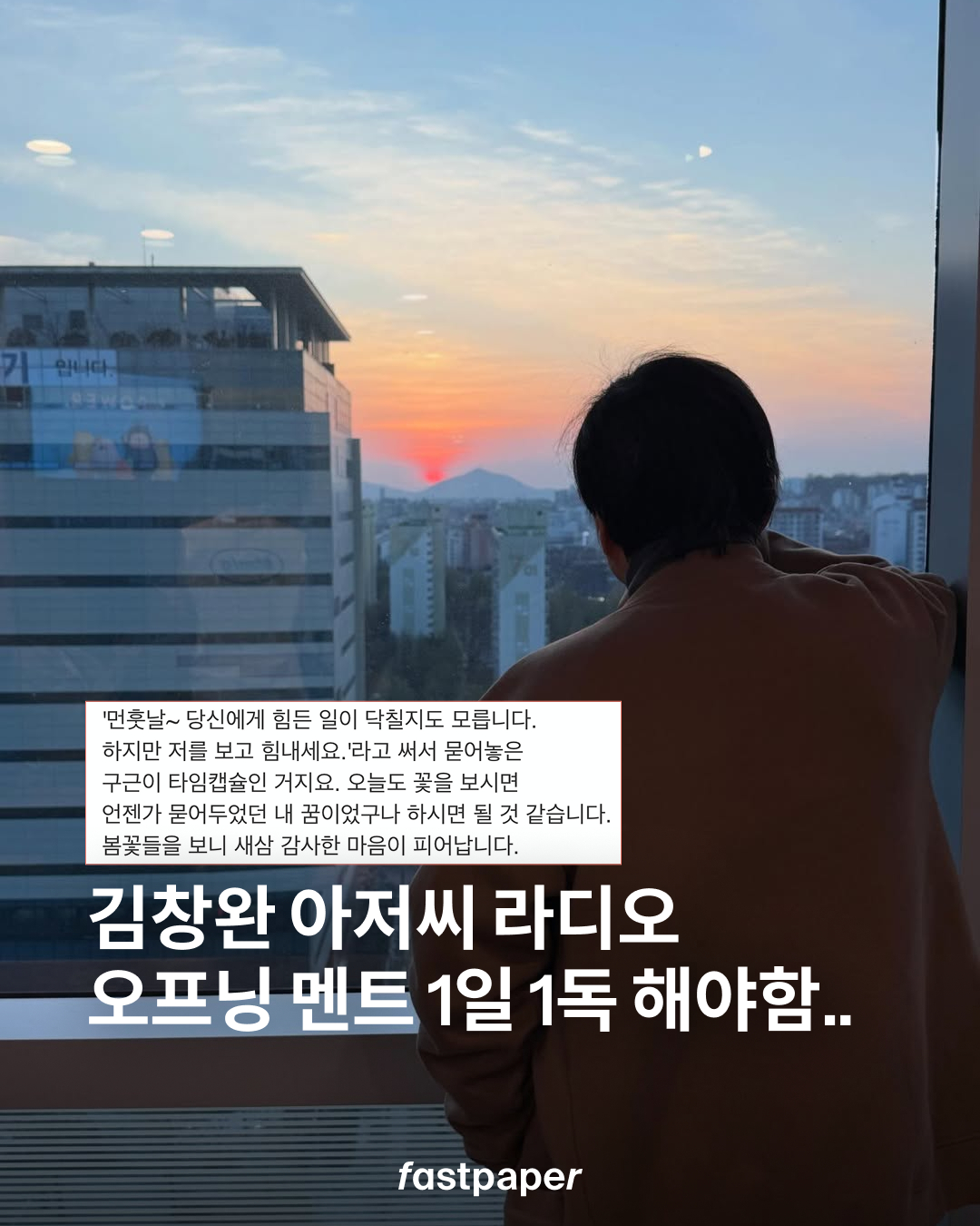 최근 라디오 공식 계정이 오프닝 멘트를 SNS에 게시하기 시작했는데요. 매일 올라오진 않지만, 앞으로 꾸준히 만나볼 수 있기를 바라봅니다. 오프닝 멘트가 더 궁금한 분들은 공식 홈페이지에서 확인해 보세요!