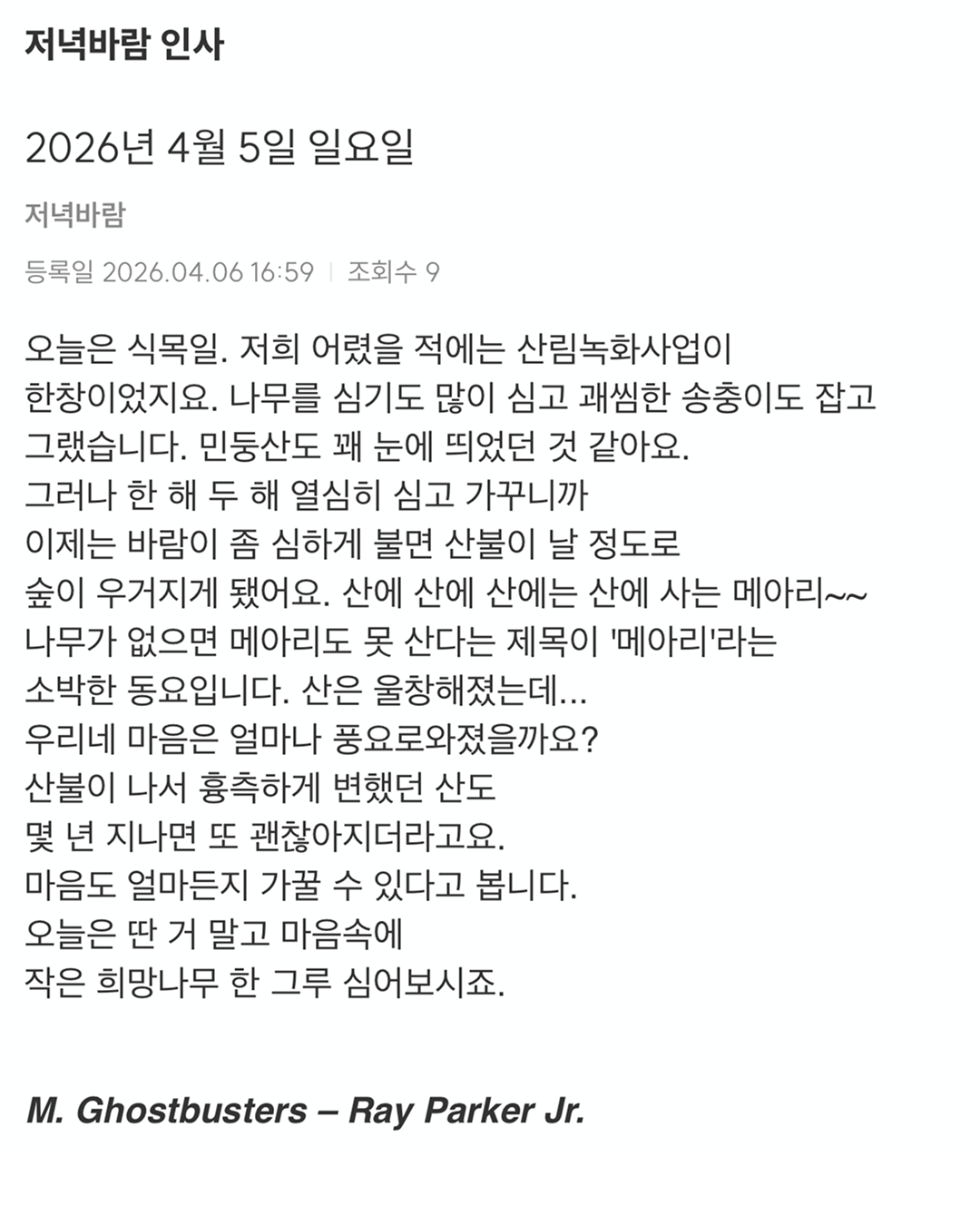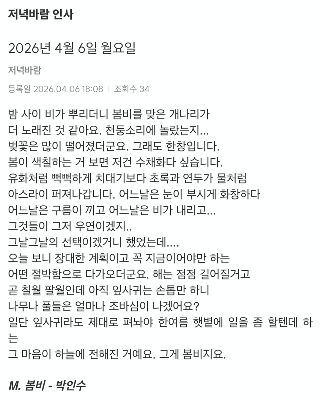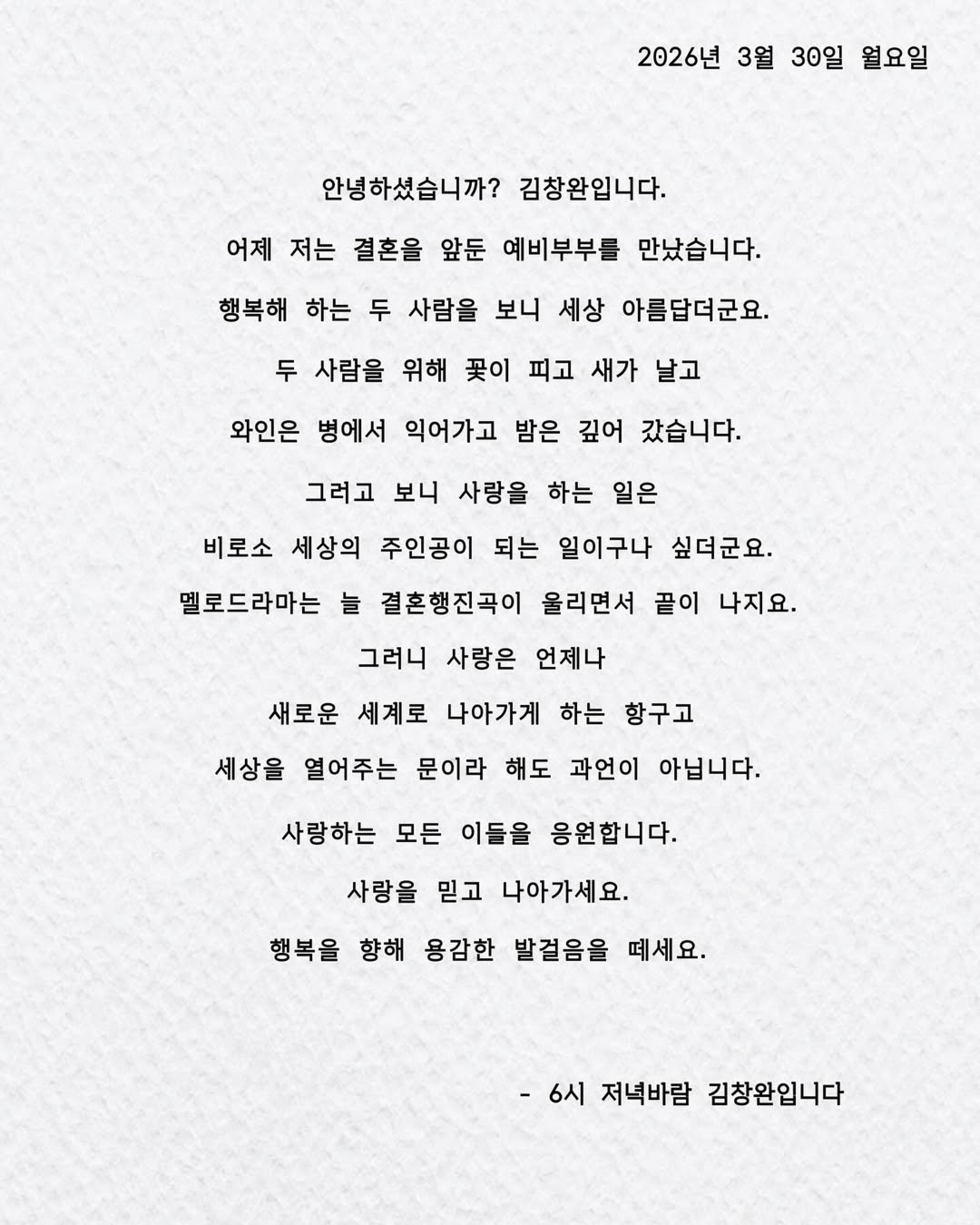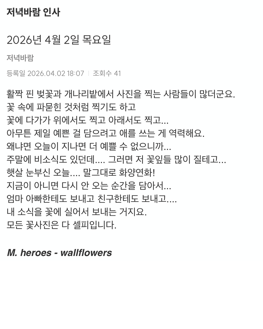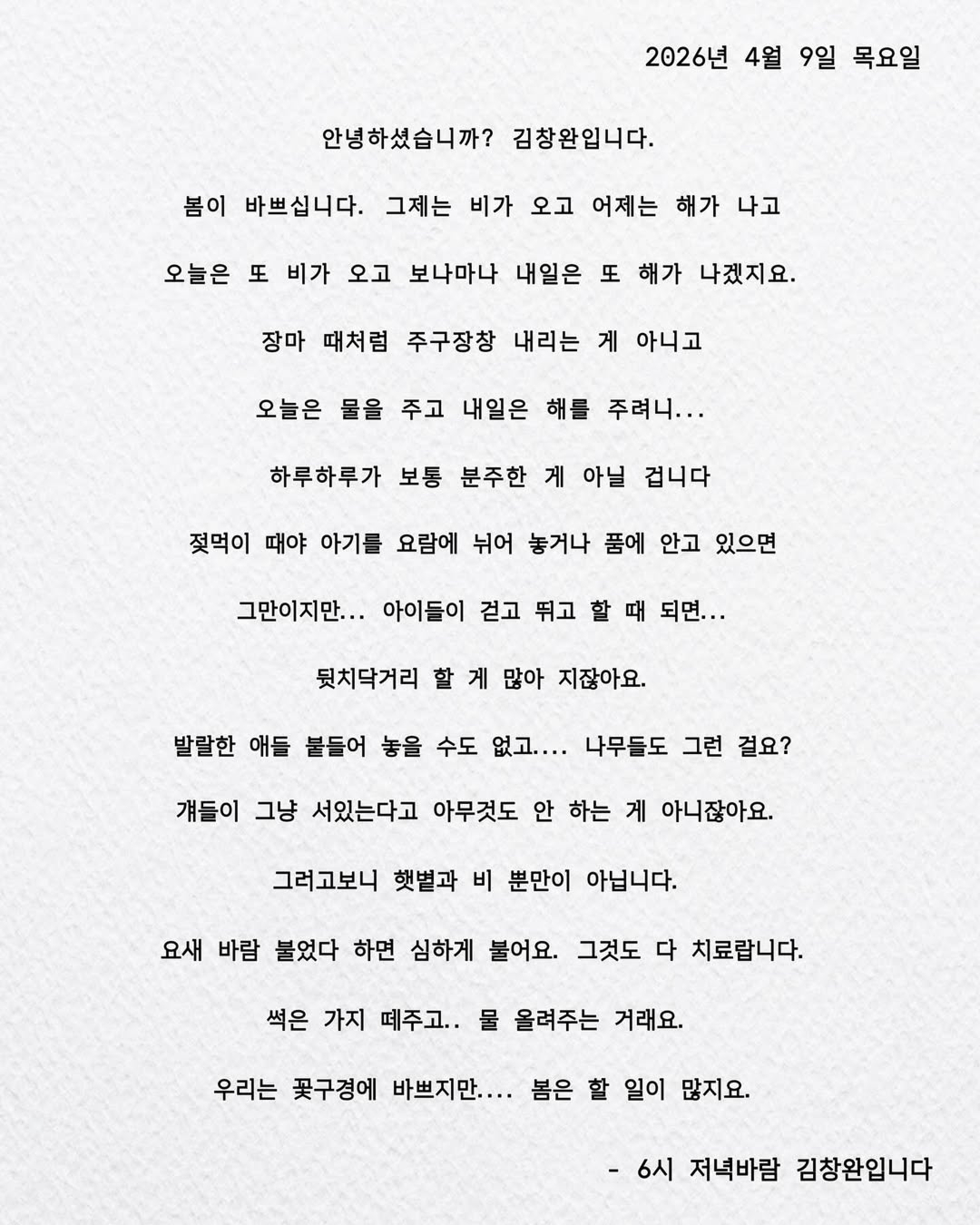 청취자들의 관심을 단숨에 사로잡는 라디오 오프닝 멘트! 첫 곡을 소개하는 발판이 되기도 하는데요. 오후 6시를 책임지는 <6시 저녁바람 김창완입니다>의 오프닝 멘트는 봄을 맞이한 듯, 따뜻한 문장들이 가득하죠.