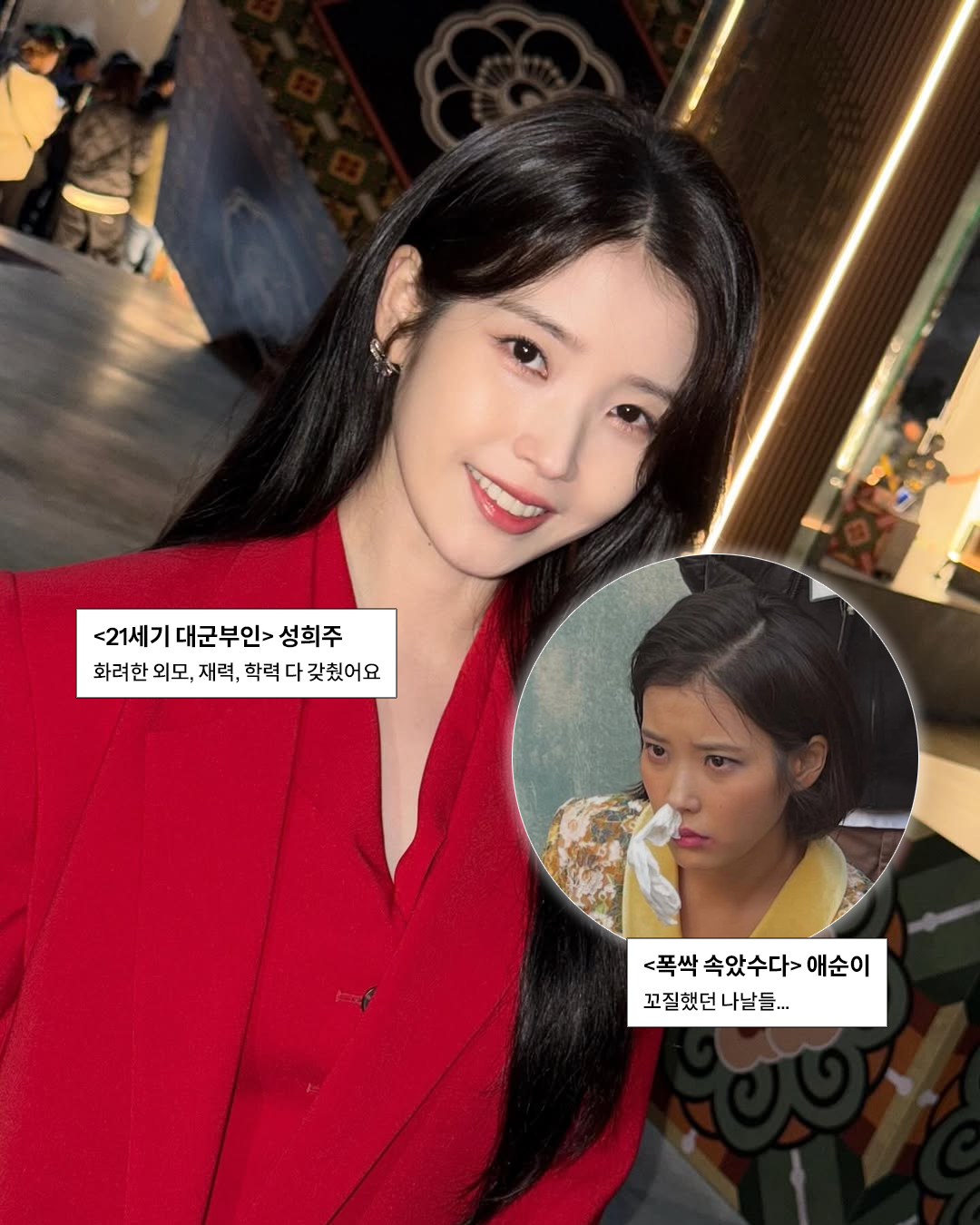 러블리 꼬질미 넘치던 <폭싹 속았수다> 속 역할들과는 달리, 화려하고 고급스러운 룩으로 변신했죠. 아이유와 채서안의 같은 인물, 다른 느낌! 어떤 역할과 룩이든 찰떡으로 소화하는 아이유와 채서안이 궁금하다면 <21세기 대군부인> 본방 사수하셔…