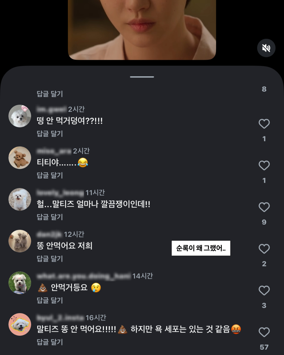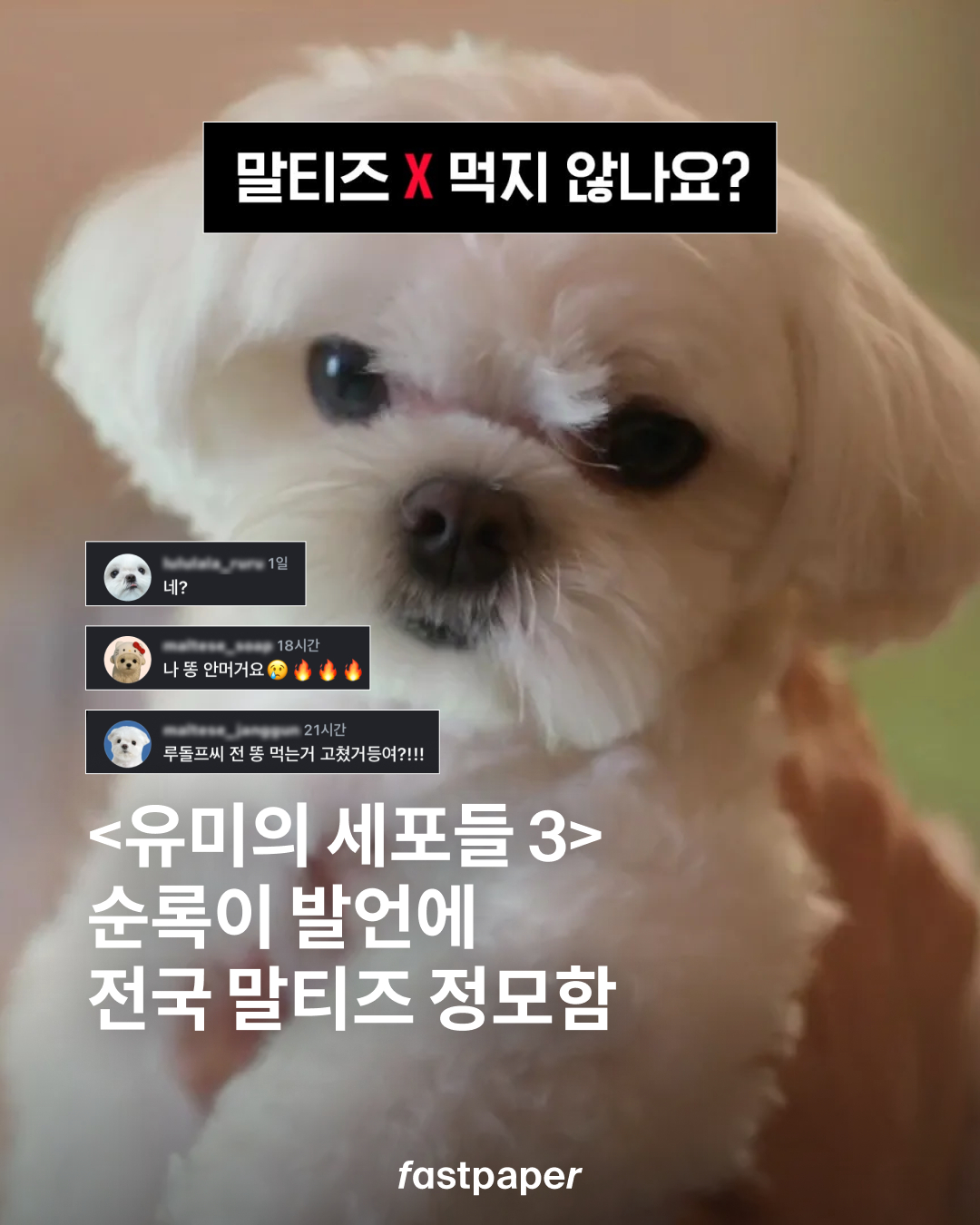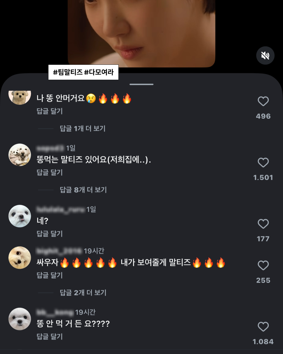 바로, 유미의 욕세포를 깨운 “말티즈 응가도 먹지 않나요?” 발언. @tving.official 이 올린 클립은 조회수 100만을 넘었는데요. 해당 게시물에는 “응가 안 먹거든요”, “싸우자” 등 수많은 말티즈 견주들이 모여 댓글을 달고 있죠. 팀 말티즈, 조금 더 힘내봅시다. 저는 말티즈 구경 좀 할게요..!