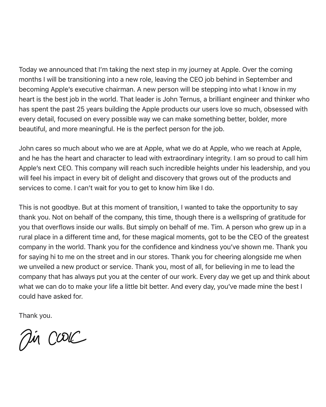 팀 쿡이 오는 9월, 애플 CEO 자리에서 물러납니다. 애플은 팀 쿡이 이후 이사회 의장을 맡고, 존 터너스 수석 부사장이 9월 1일부터 새 CEO로 취임한다고 밝혔는데요. 이번 인사는 이사회 만장일치로 결정됐습니다.