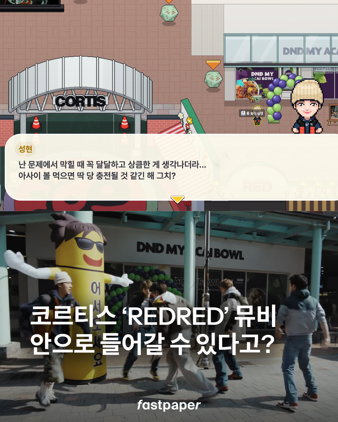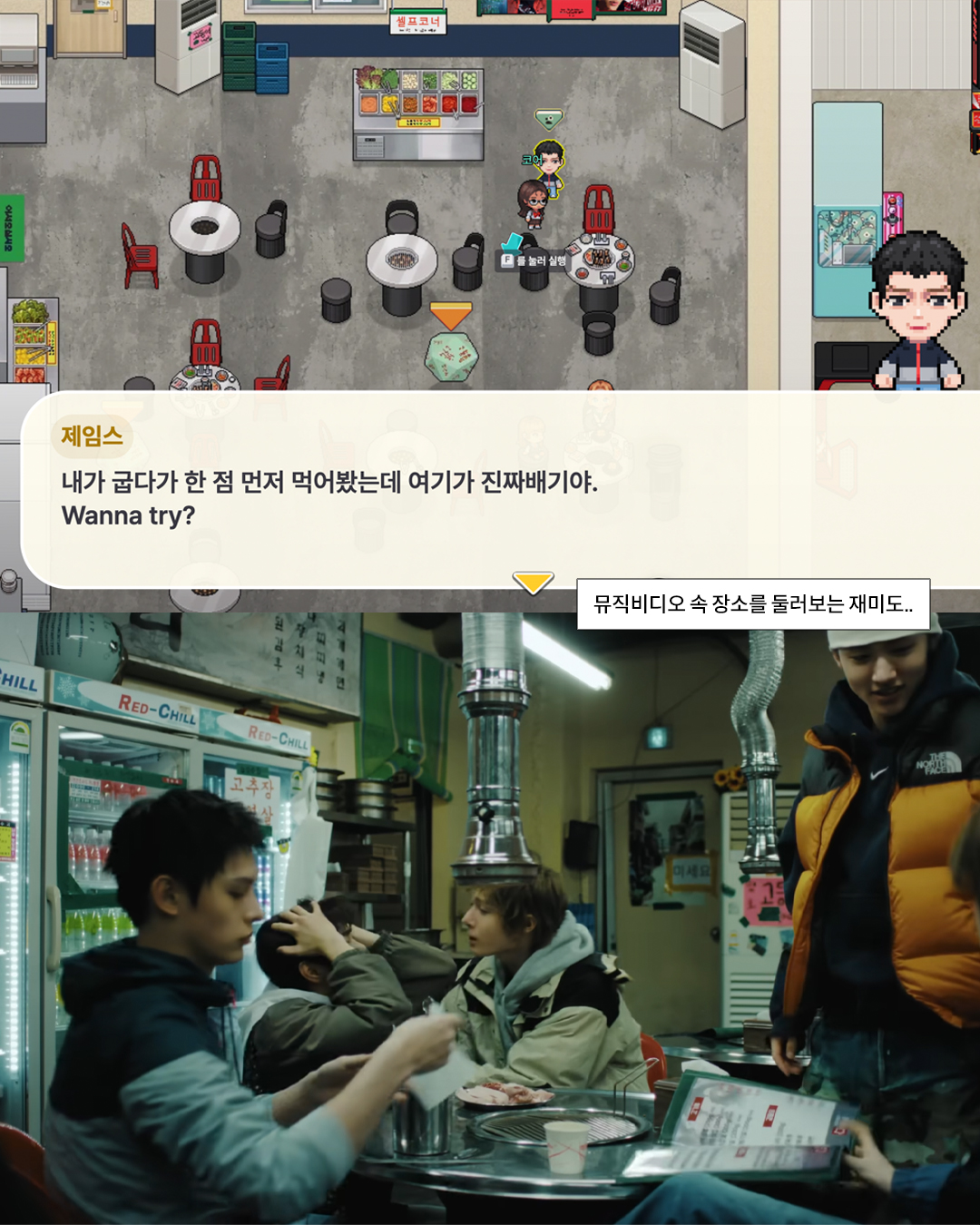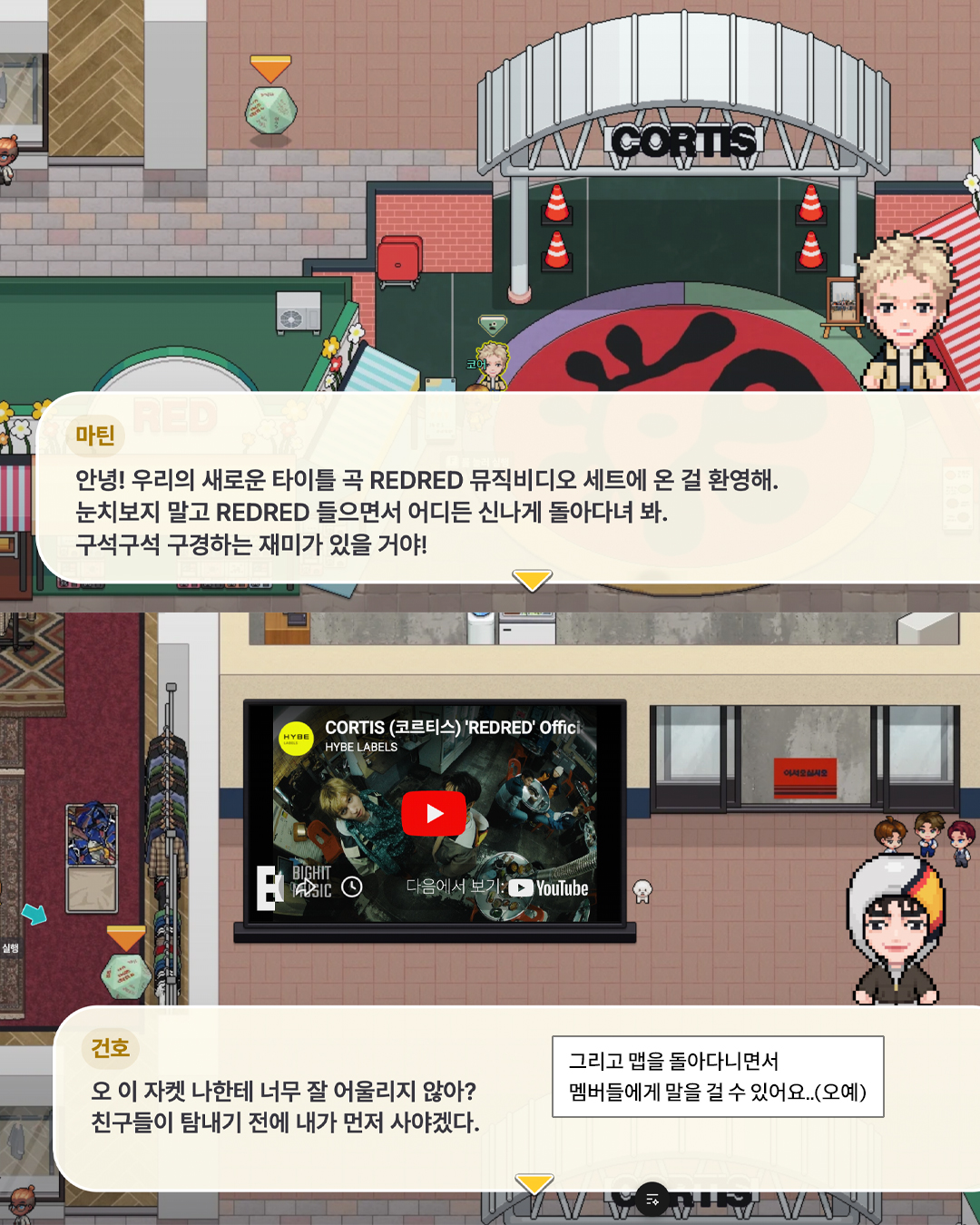 ‘REDRED’ 뮤직비디오 속 삼겹살집, 길거리, 오락실까지.. 장면들이 그대로 맵 안에 구현됐고요. ‘Dice ver.’ 앨범 형태의 퀴즈 오브젝트까지 더해져, 문제 푸는 재미에 팬덤 체험 요소까지 더했습니다.