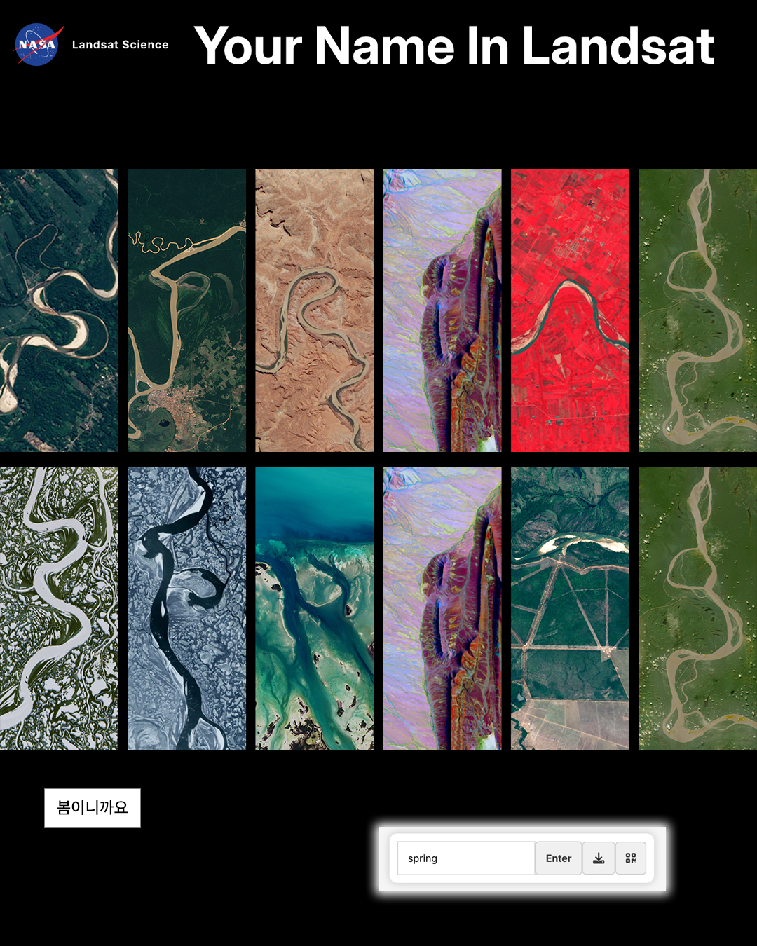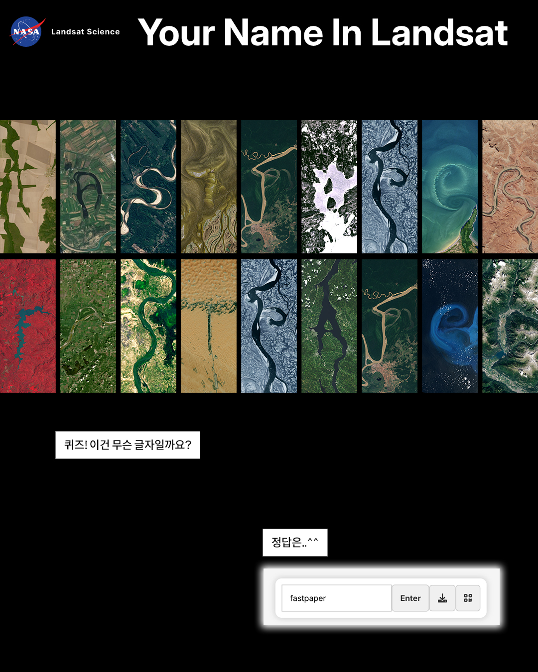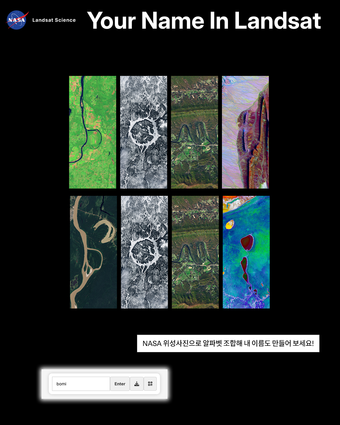 사이트에 이름을 입력하면, NASA와 미국 지질조사국이 실제로 촬영한 지구 위성 사진들이 알파벳처럼 조합됩니다. 사막, 강, 산맥, 해안선 같은 지구 풍경들이 한 글자씩 이어지면서 하나의 이름이 완성되는 방식이에요.