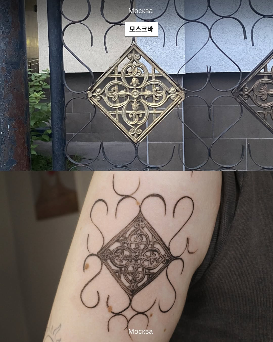 길을 걷다 발견한 펜스가 타투가 된다면? 모스크바 기반 타투 아티스트 @hog.tatt는 도시의 건축에서 영감을 받습니다. 그는 직접, “어느 도시를 걷든 눈길을 끄는 무언가가 있고, 비슷해 보여도 각 도시의 역사와 맥락이 만들어내는 고유한 결이 있다”며 그가 만든 타투 도안을 설명했죠.
