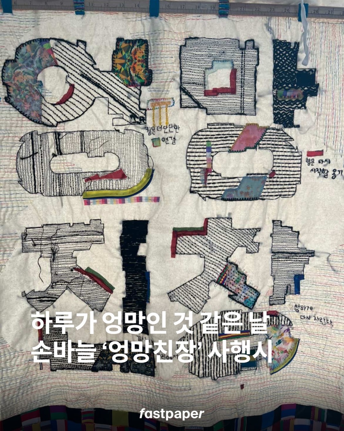 가끔 엉망인 하루여도 괜찮아..^^ 자수 아티스트 @workrm.4clara 가 올린 ‘엉망진창’ 자수 사행시. ‘엉킴은 더 단단한 연결, 망함은 다시 시작할 용기, 진짜는 부서진 자리에서, 창창하게 다시 자란다’라는 문장을 손바느질로 한 땀 한 땀 만들었죠. 작가는 조선시대 문자도를 새롭게 재해석했다고!