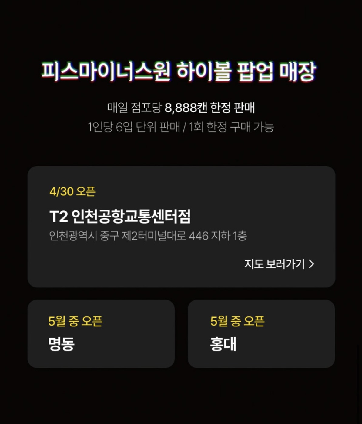 지디가 직접 만든 ‘피스마이너스원 하이볼’, 출시와 함께 팝업 매장을 연다는 소식입니다. 첫 팝업은 오늘 4월 30일 인천공항 제2터미널 교통센터점에서 시작됐고, 5월 중 명동과 홍대 CU 매장에서도 순차 오픈될 예정인데요!