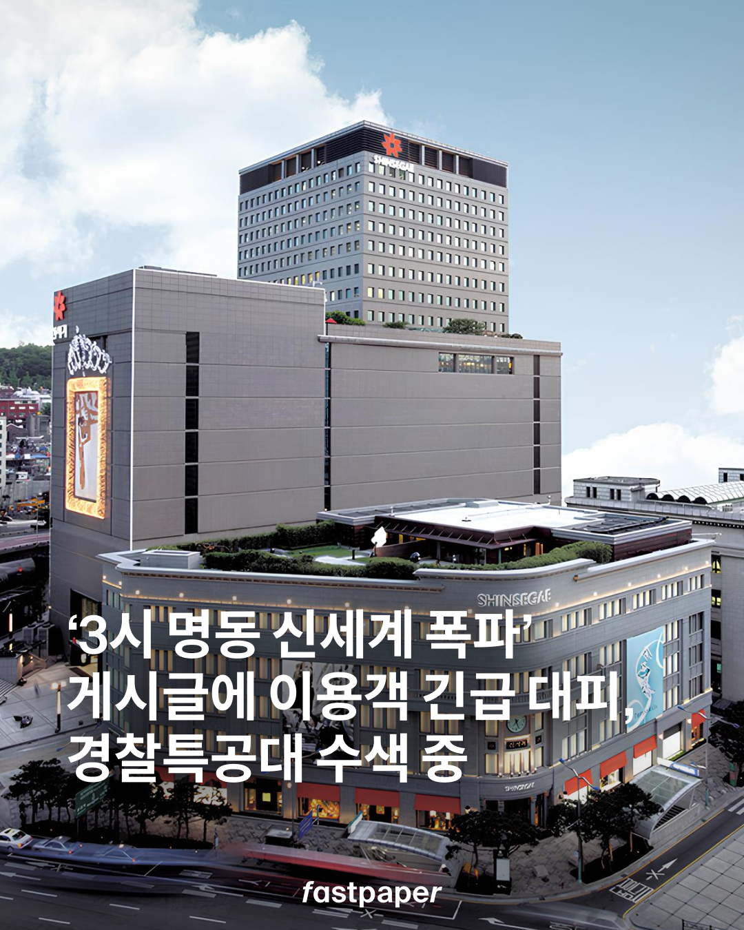 오늘 낮 12시 30분경 한 온라인 커뮤니티에 ”신세계백화점 본점 절대 가지 마라. 어제 여기에 진짜로 폭약 1층에 설치했다. 오늘 오후 3시에 폭파된다“라는 내용의 협박 글이 게시되었습니다. 경찰은 백화점 내 매장 직원 고객 전원을 대피시켜 현재 차량 출입 통제 중이며, 경찰특공대를 투입해 실제 폭발물 여부를 확인하기 위한 수색을 진행 중입니다.
