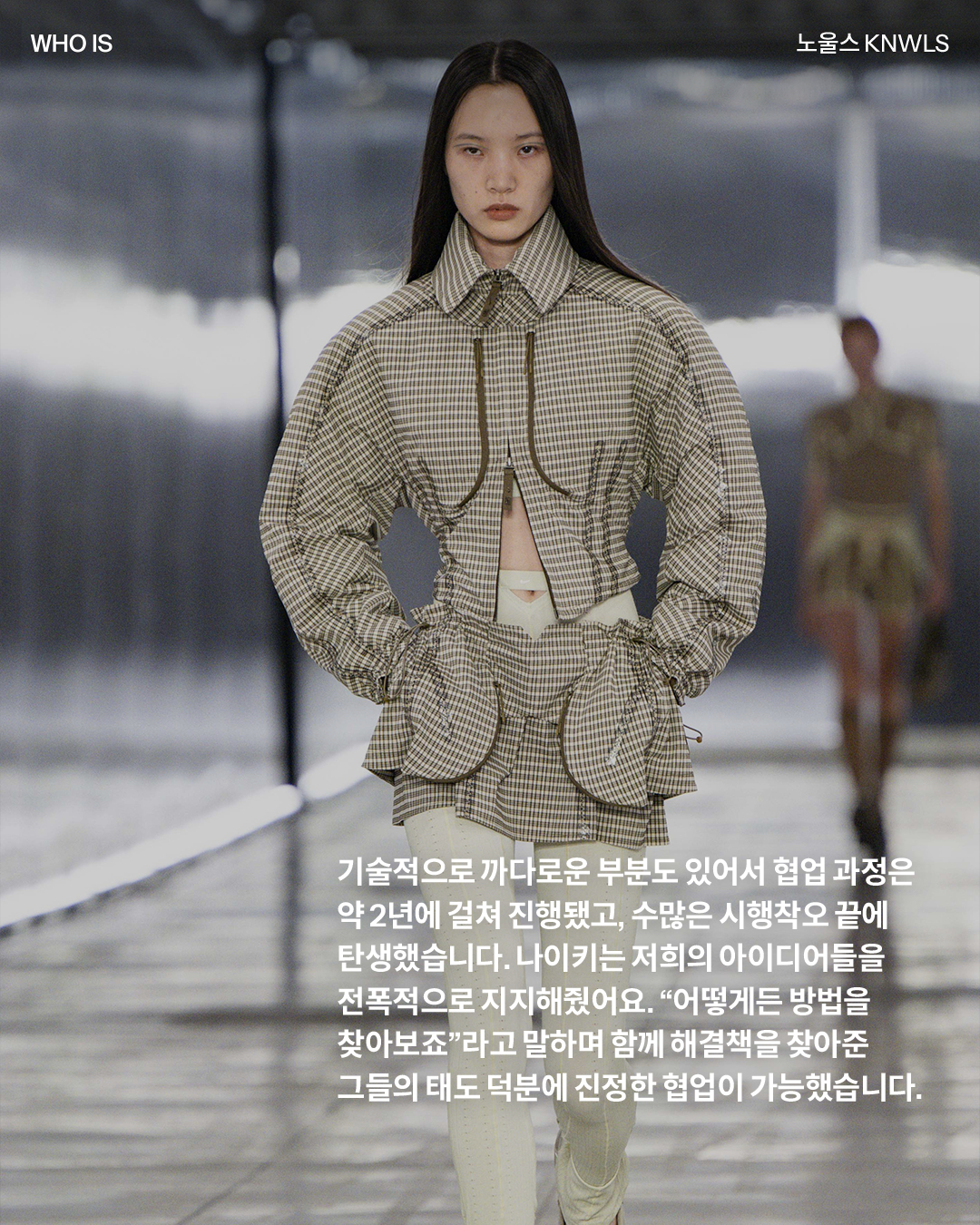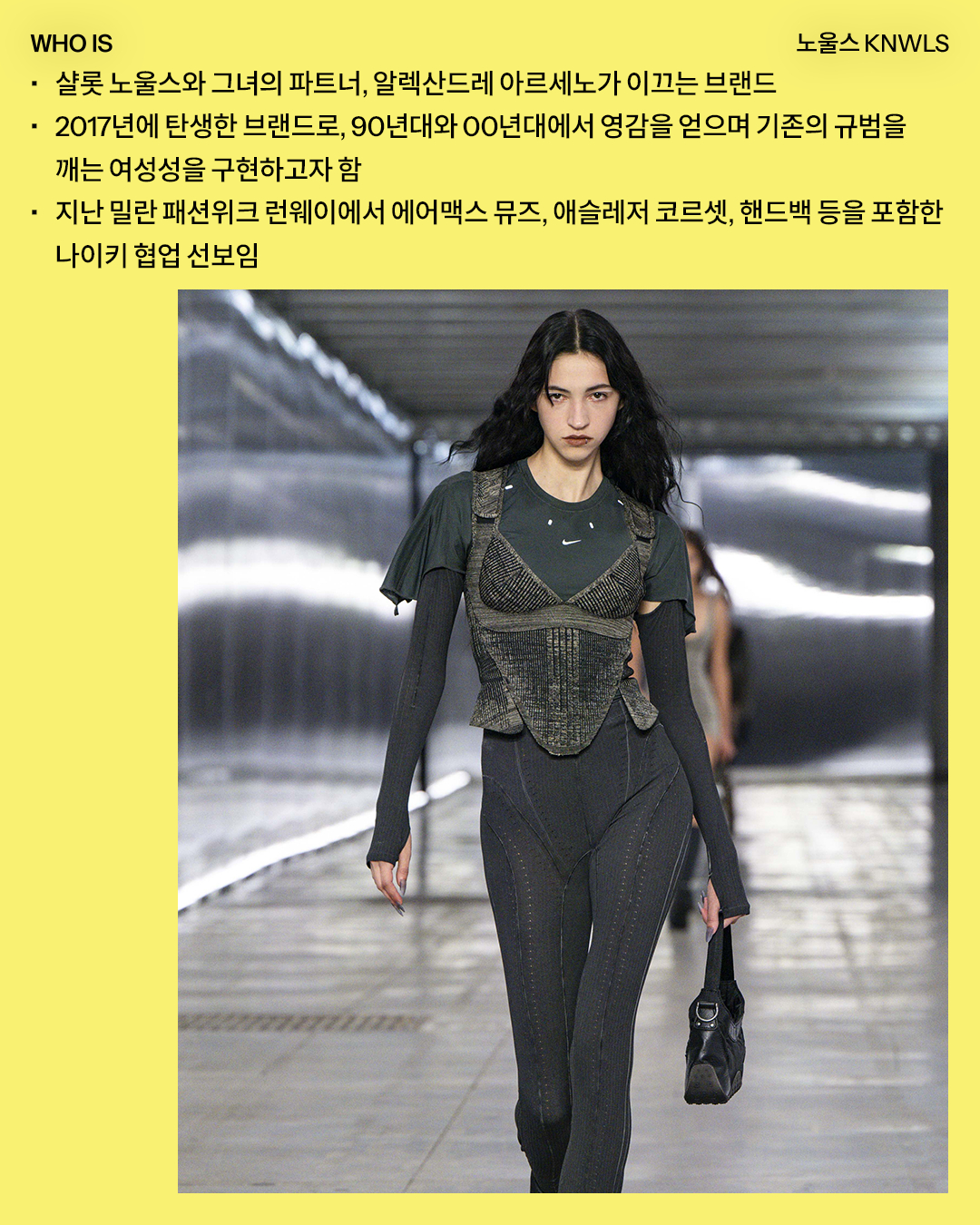 지난 9월, 패스트페이퍼가 밀란 패션위크 취재 중 포착한 나이키 협업의 주인공이죠. 2017년에 론칭해 수많은 여성들의 사랑을 받고 있는 브랜드 노울스(KNWLS)의 두 디자이너, 샬롯 노울스(Charlotte Knowles)와 알렉산드레 아르세노(Alexandre Arsenault)를 만났습니다.